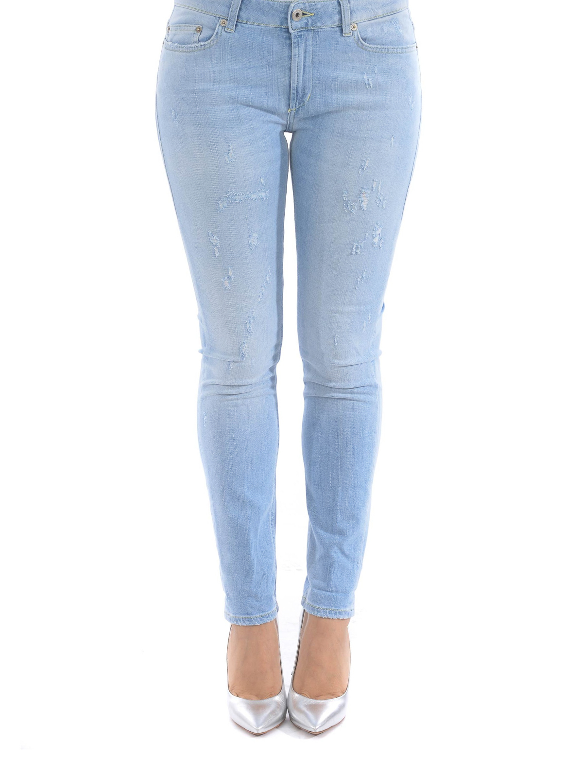 Stretch denim five pockets jeans detailed with little scratches, belt loops and zip and button fastening.