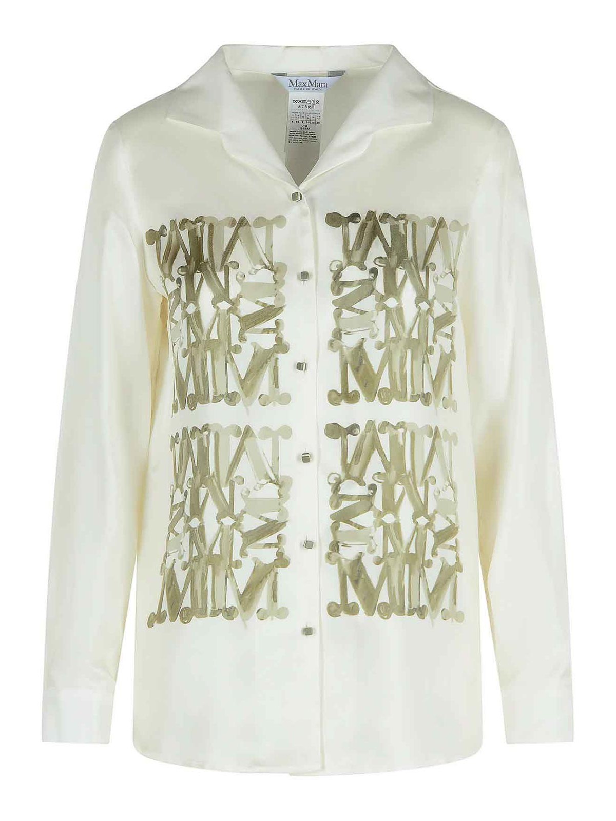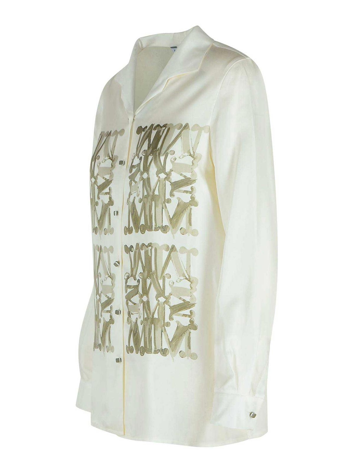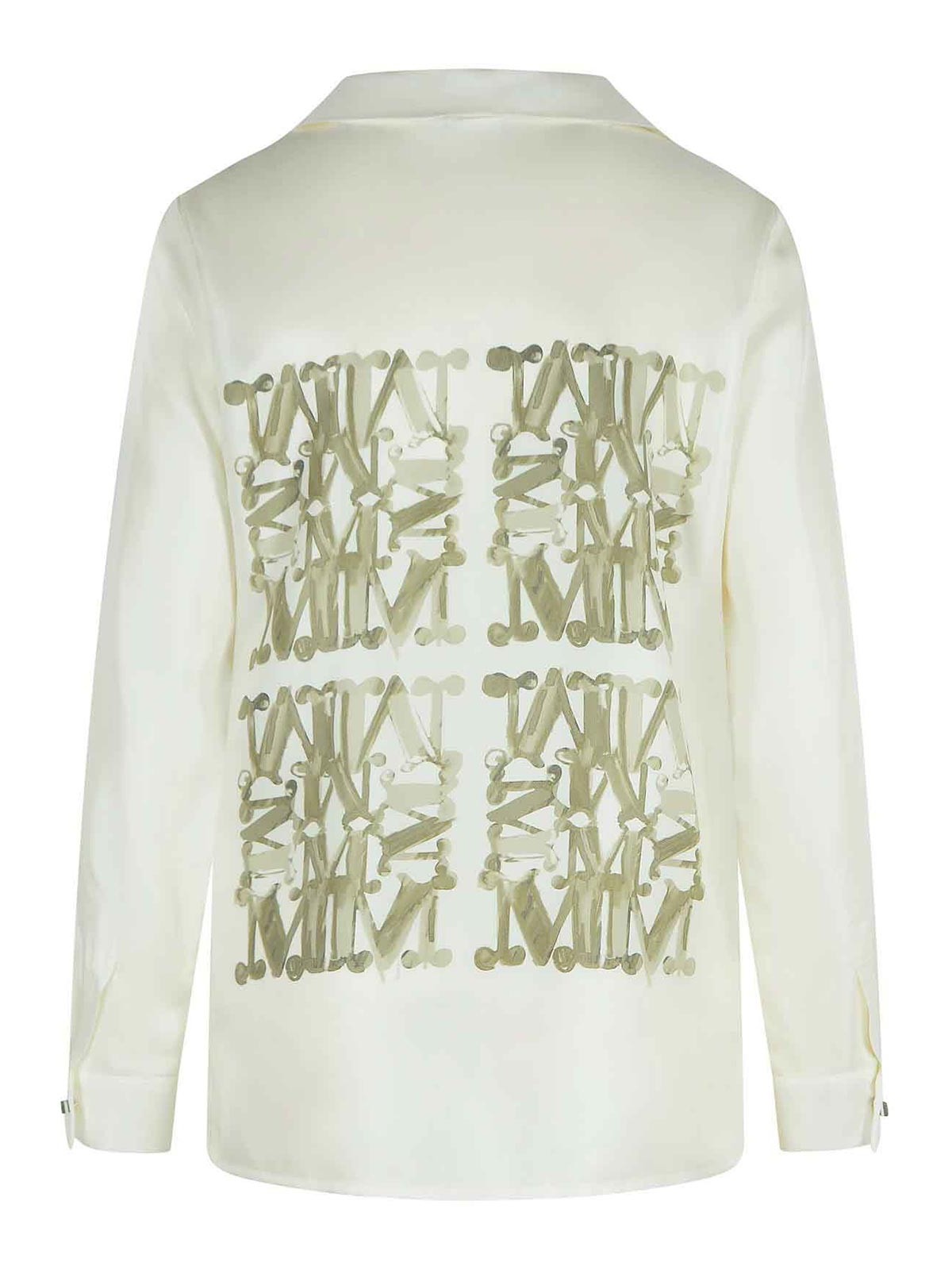 Silk twill shirt small bowling collar military green m monogram print on the long sleeves with cuffs and side button visible geometric button straight hem with small side slits