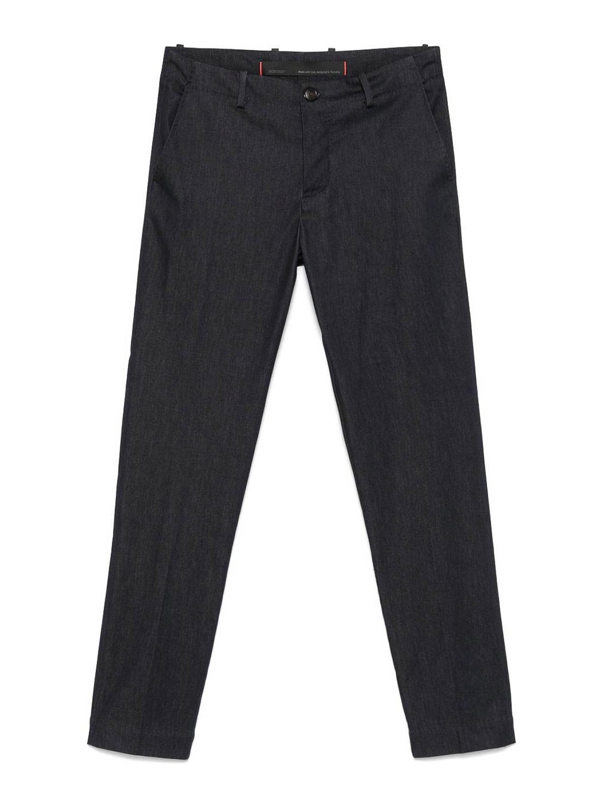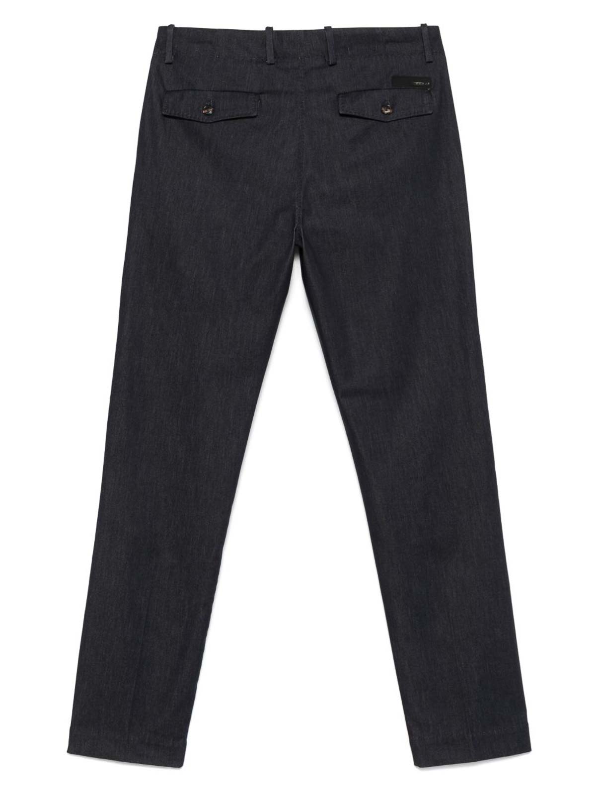 Navy blue trousers from rrd roberto ricci design featuring button placket belt loops two side slash pockets two rear flap pockets