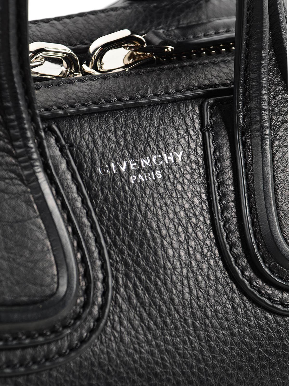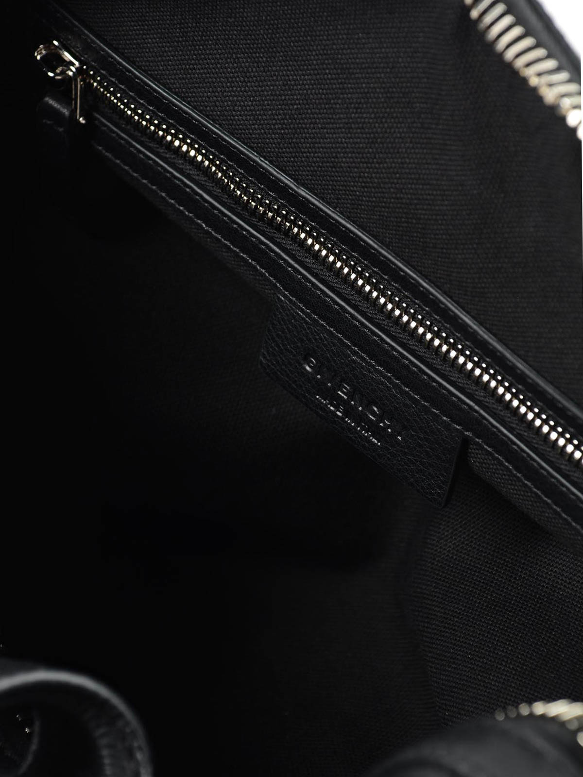 Grainy leather bowling bag detailed with double padded handle, top zip fastening featuring double pull, detachable and adjustable shoulder strap. Fabric lining featuring one inner open pocket and one inner zip pocket.