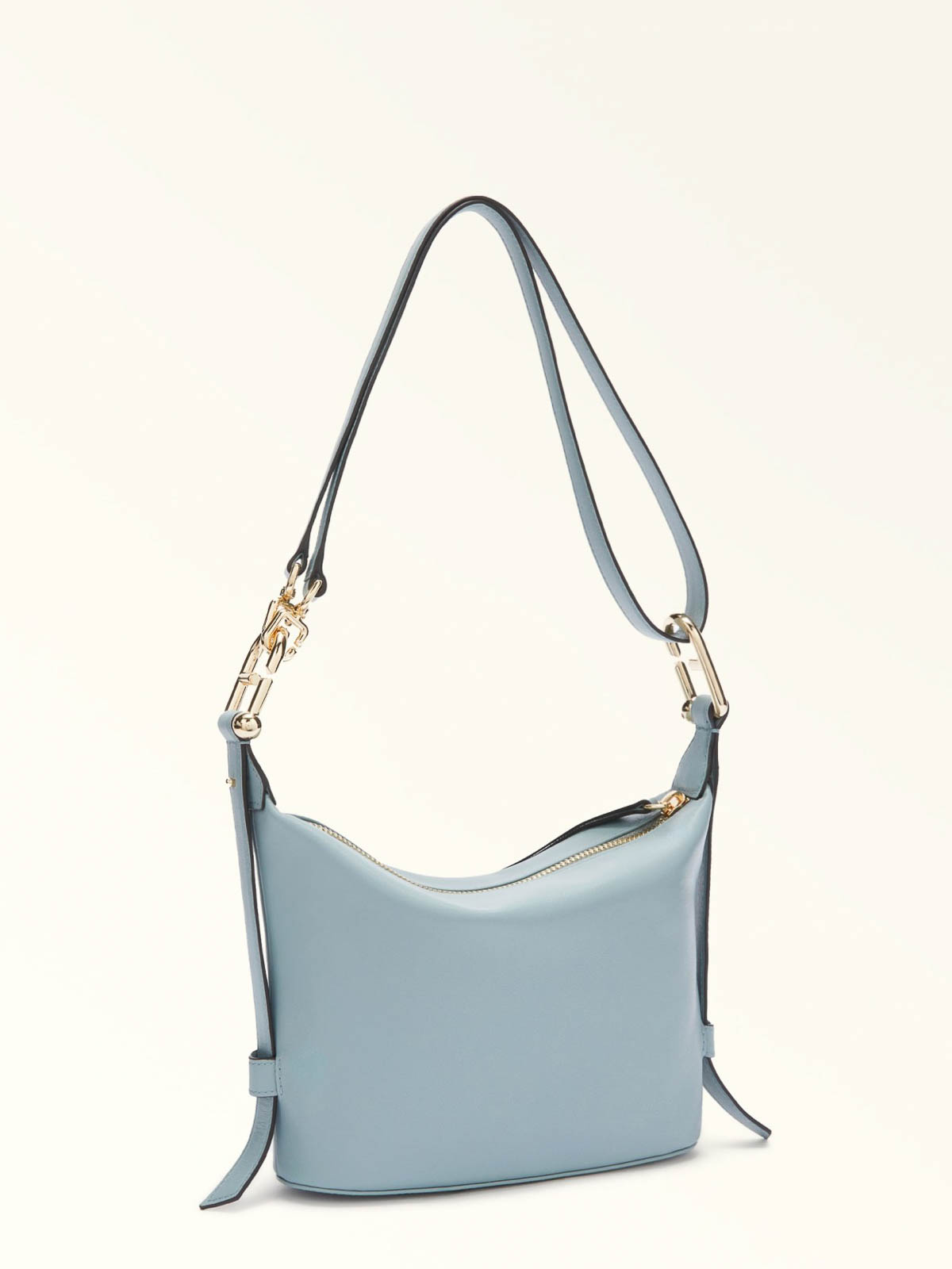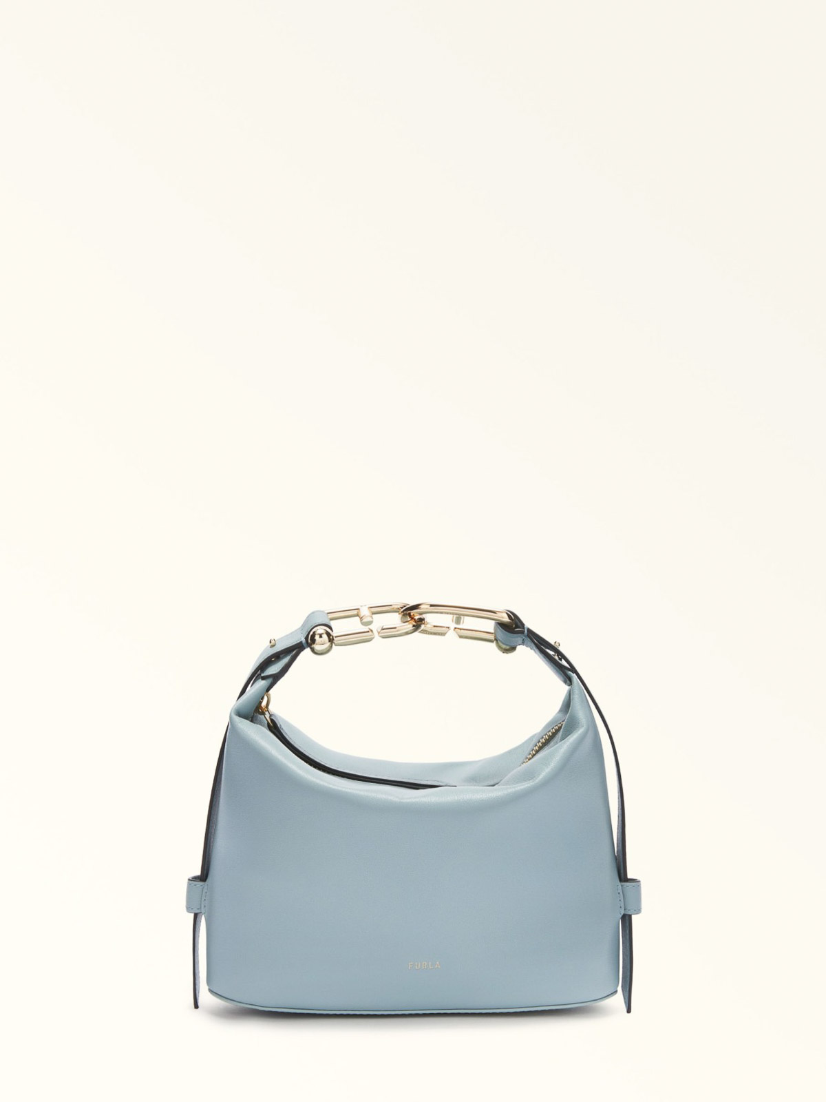 Furla Nuvola Mini Sugar handbag made of soft with a natural grain finish, the rounded shape completed by an upper held together by two intertwined Arcosfera metal accessories that combine the iconic Furla Arch logo. Bag that can be worn by hand and also with coordinated internal open pocket. Six internal compartments for credit cards with zip. Furla logo print on the removable and non-adjustable.