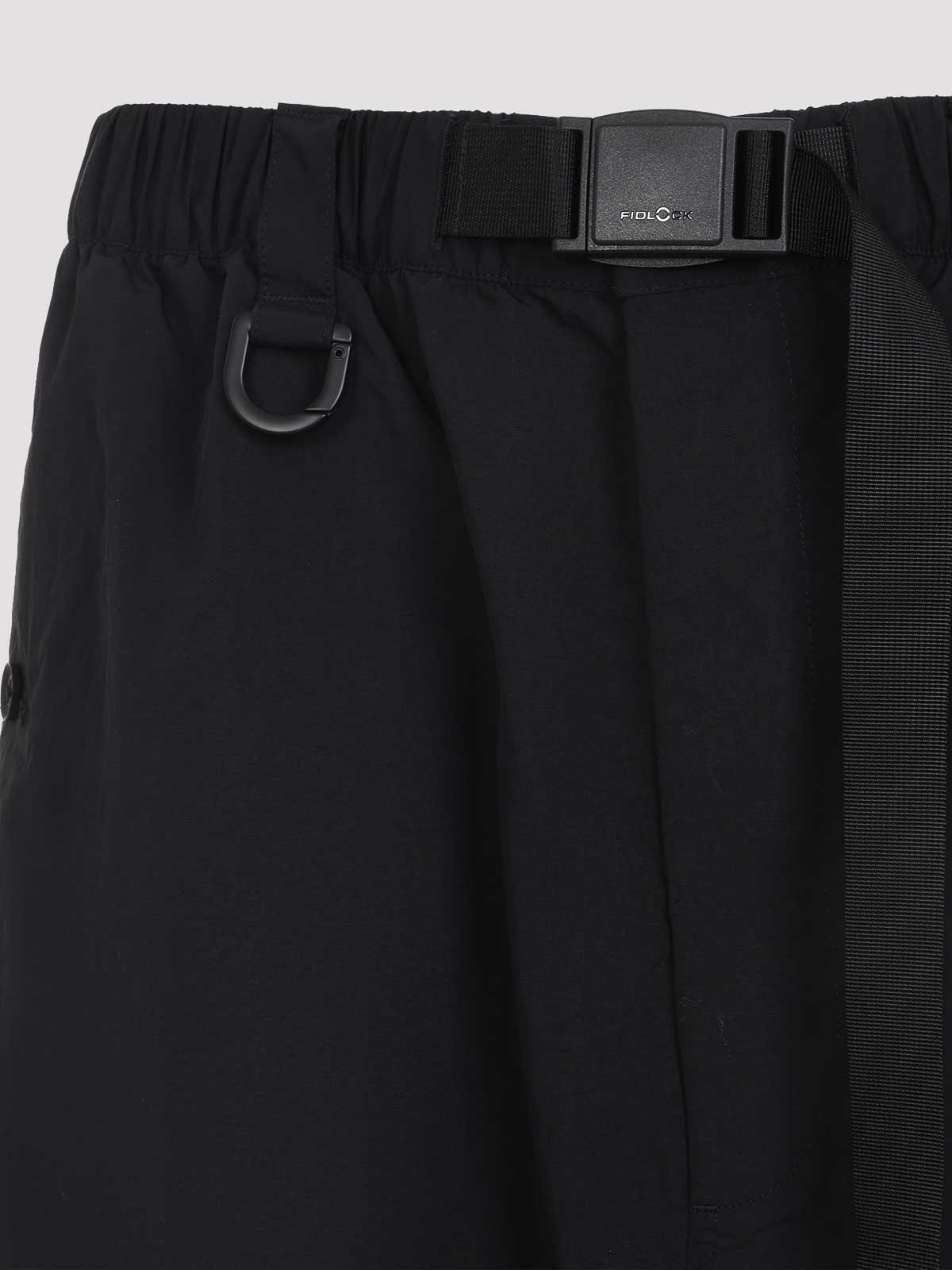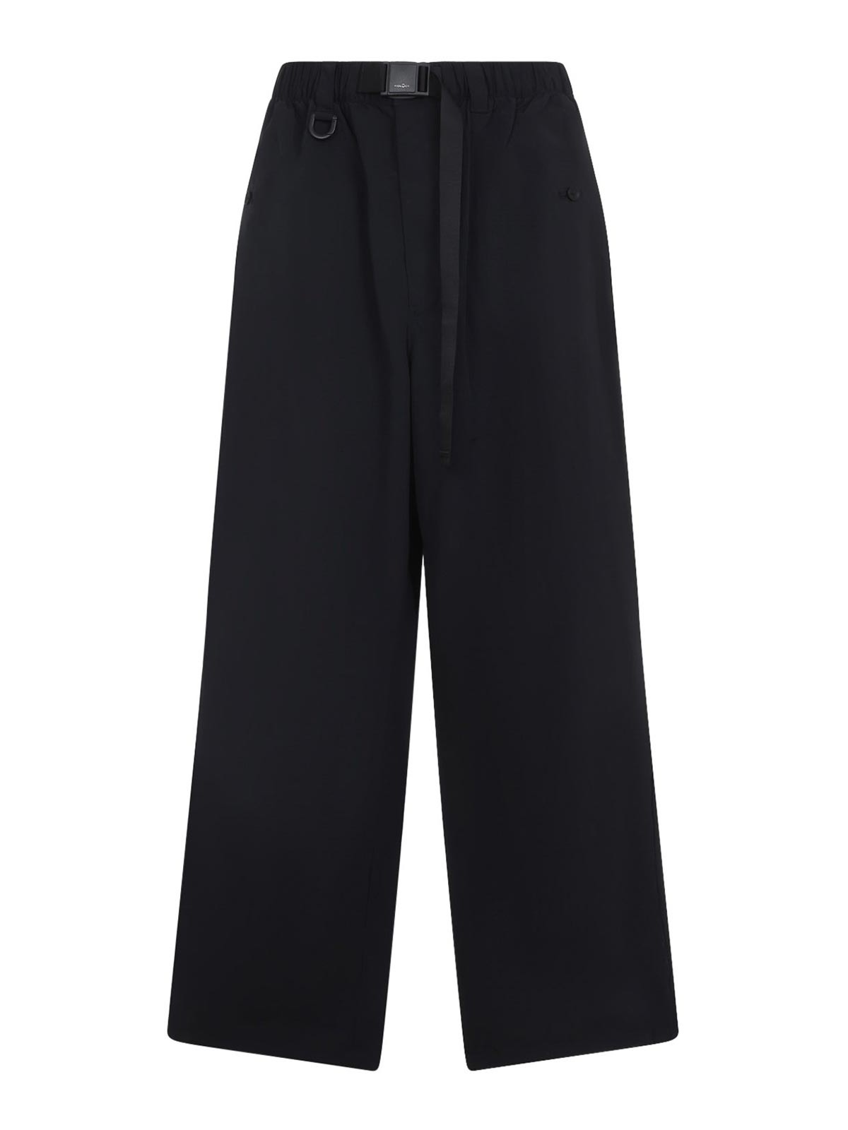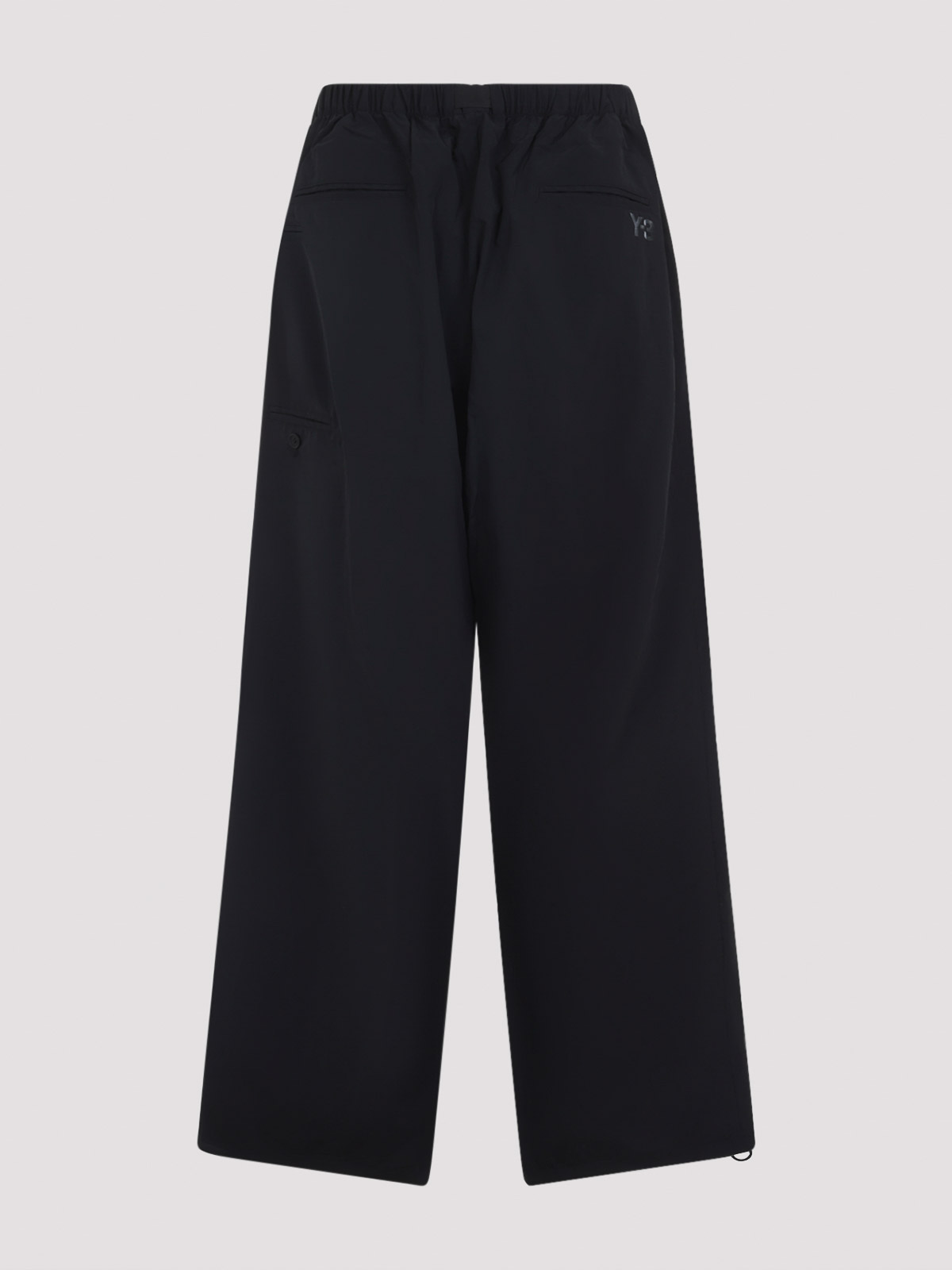 Y black pants crafted from black elastic waistband with press, release belt belt loops button and fly, zip side pockets two pockets on the back with an additional mini pocket logo stamped on the back wide leg adjustable cuffs