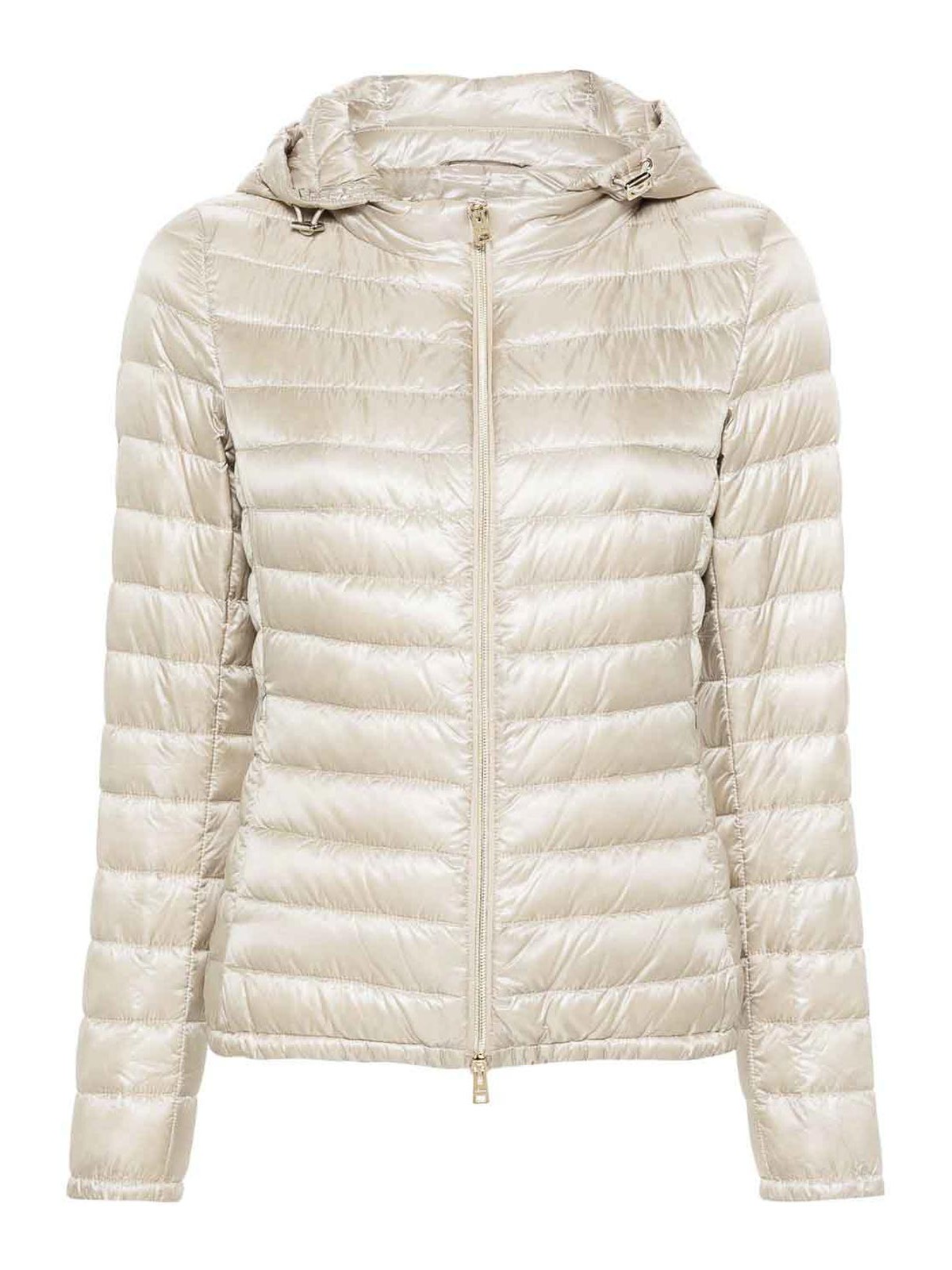 Ecru padded design quilted, tone logo plaque logo, engraved, tone hardware detachable drawstring hood two, way zip long sleeves elasticated cuffs two side zip, pockets elasticated hem quilted