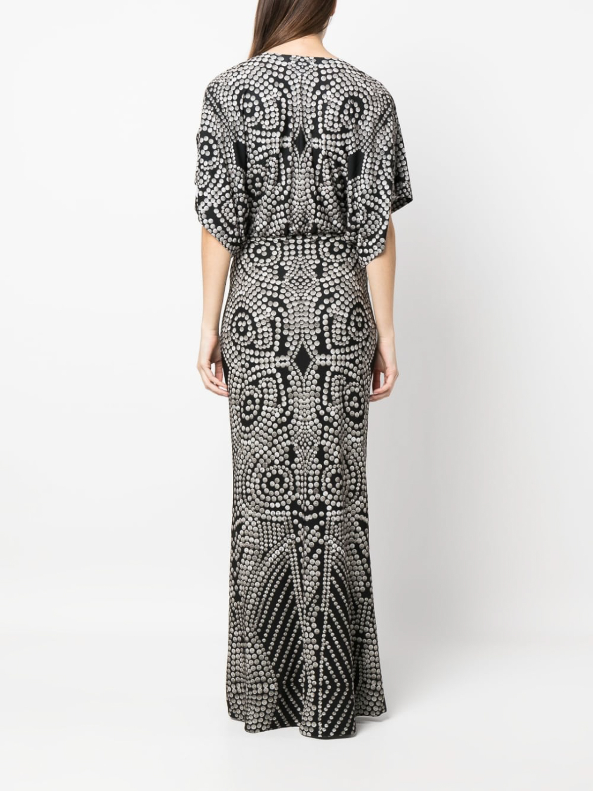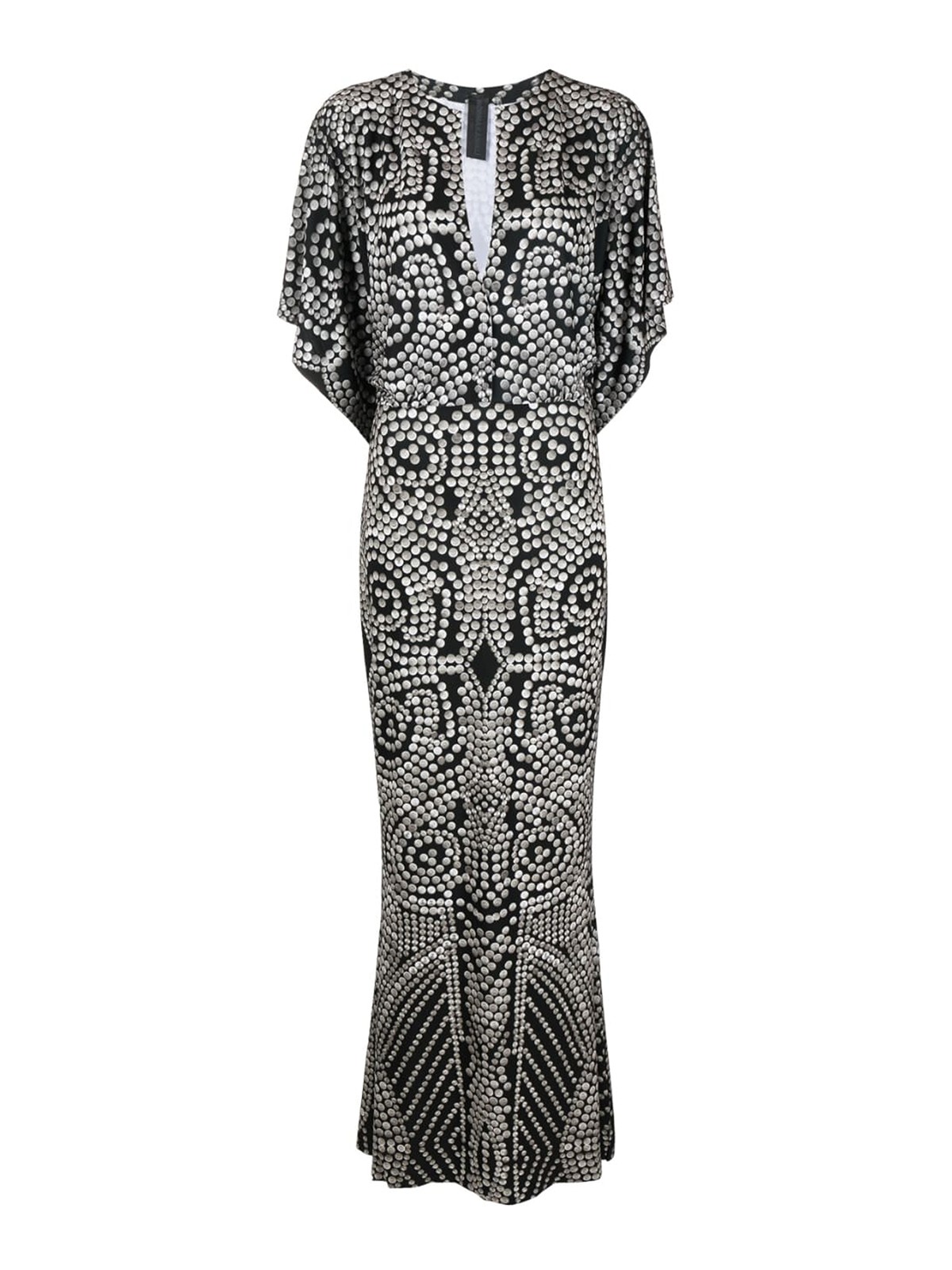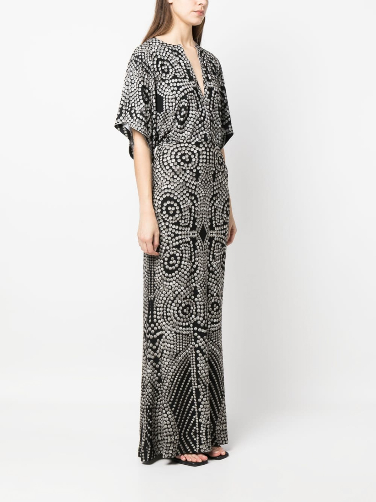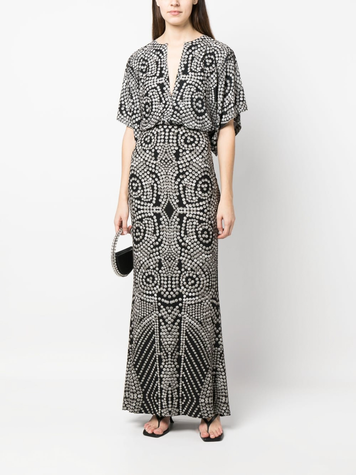 Stud-print long dress jet black, all-over graphic print, v-neck, short sleeves and straight hem.