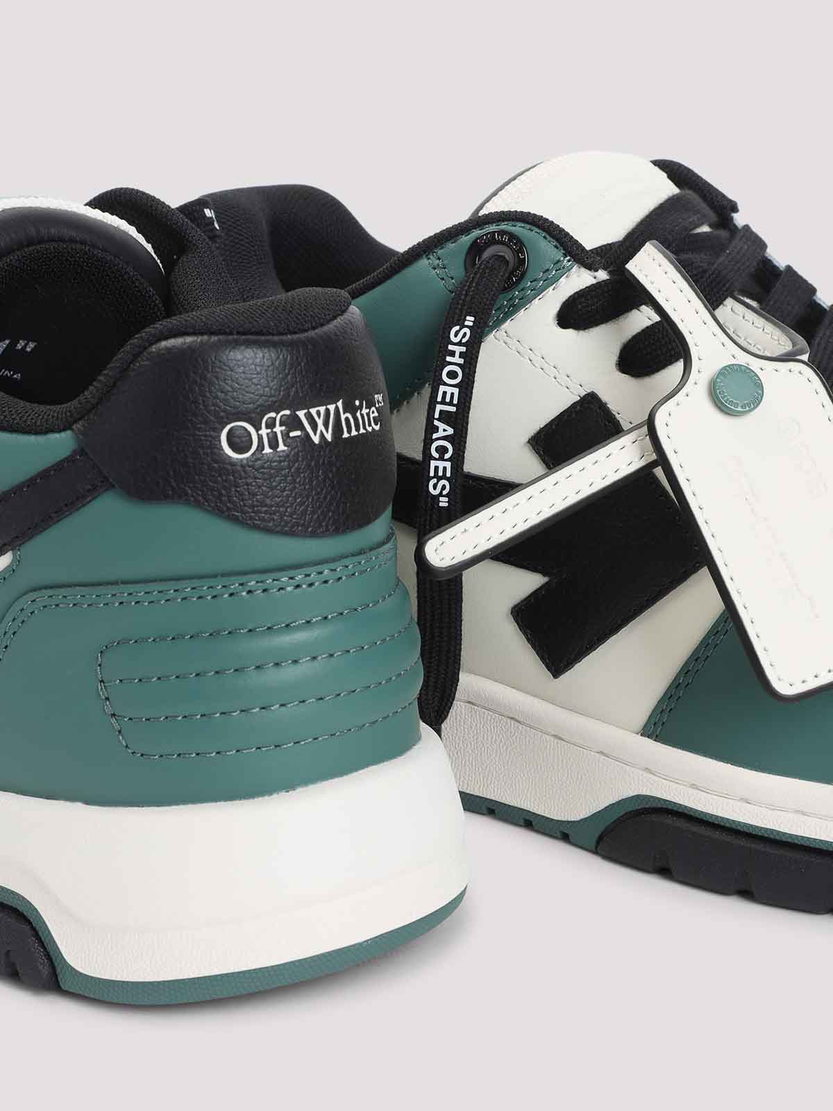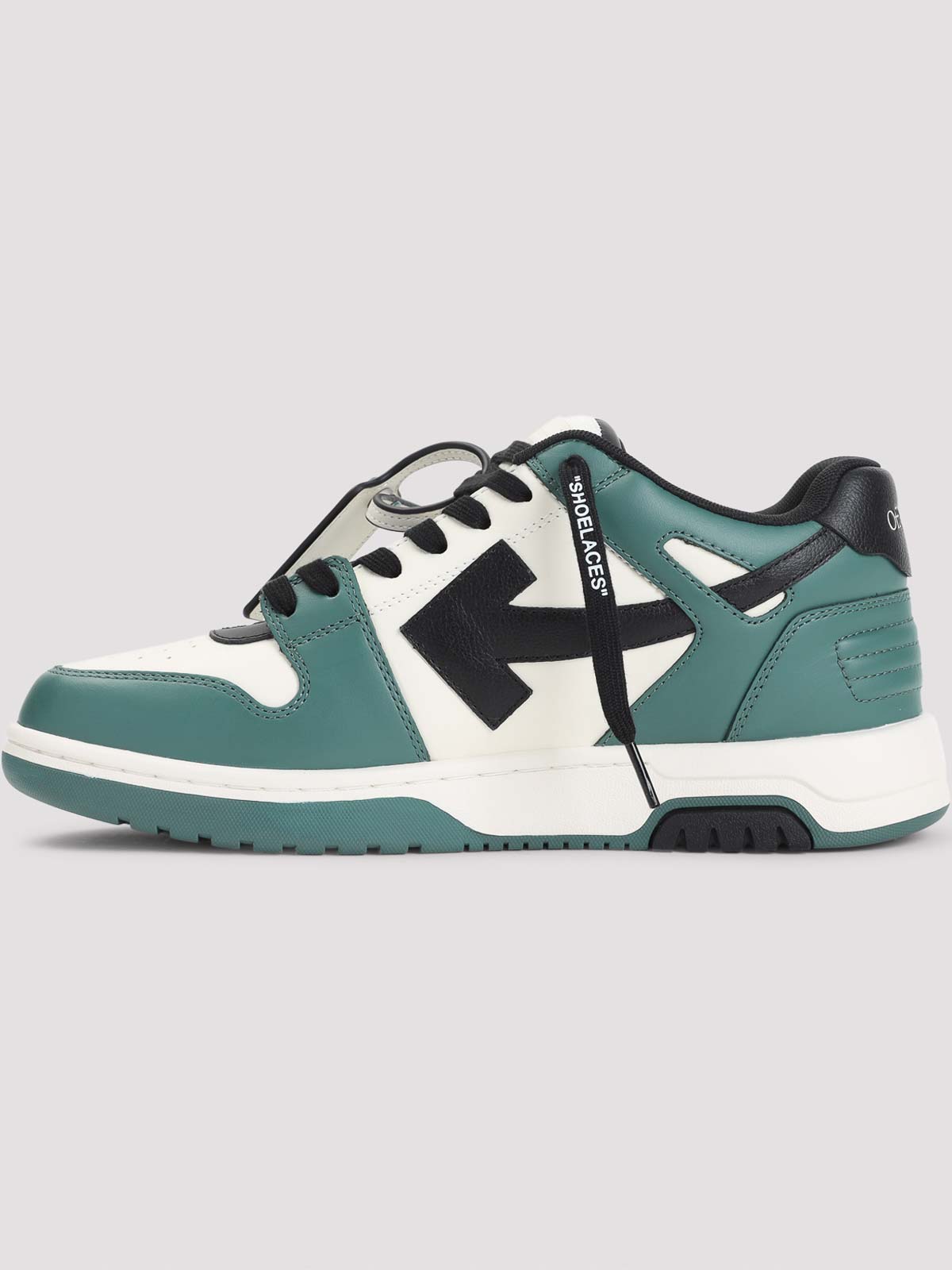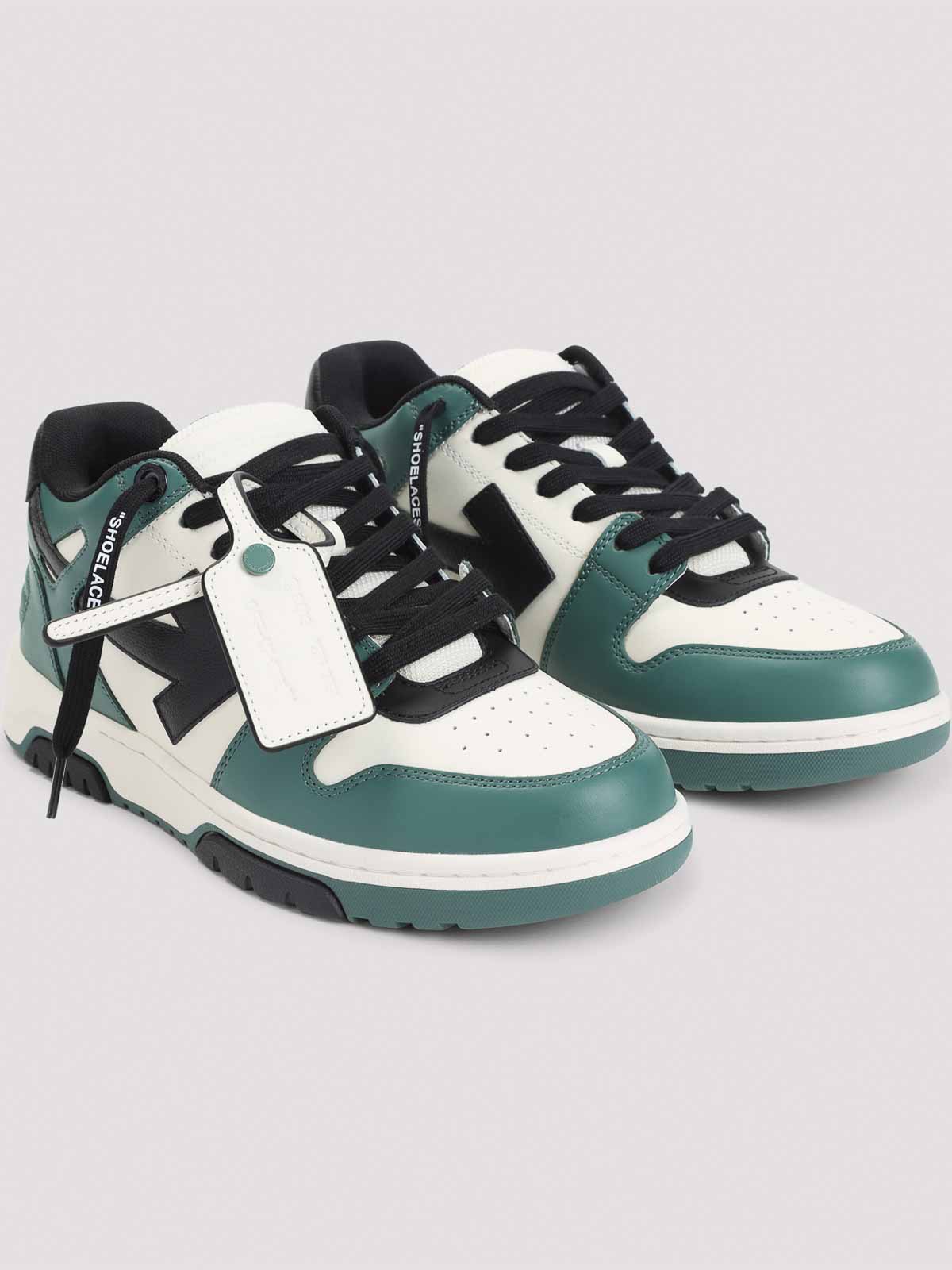 Off white green out, of, office sneakers crafted and round toe top perforated top black lace, up side white logoed tag white on the side black arrow back contrasting white logo black and white
