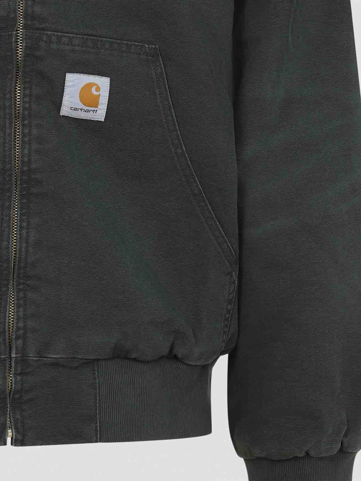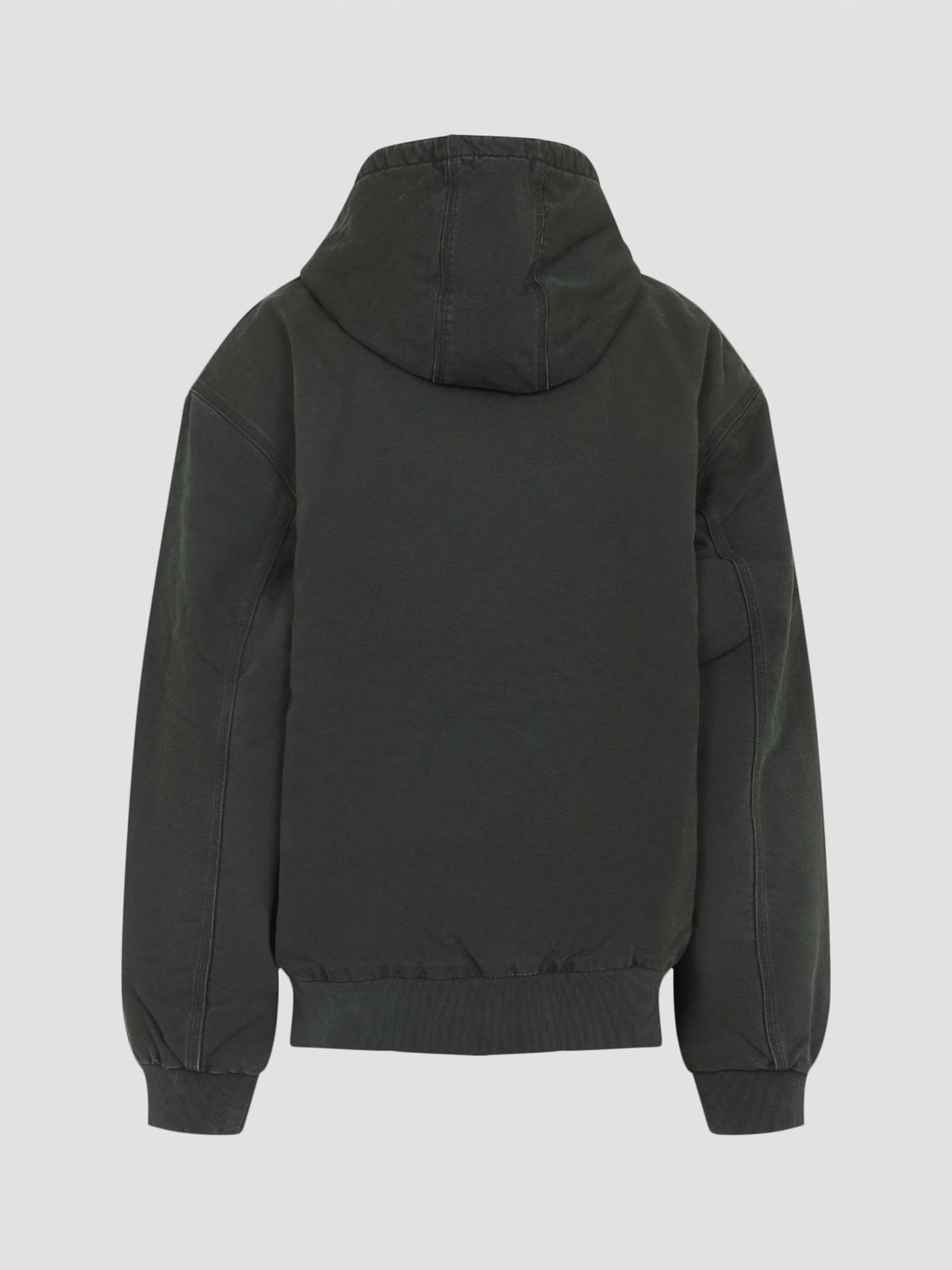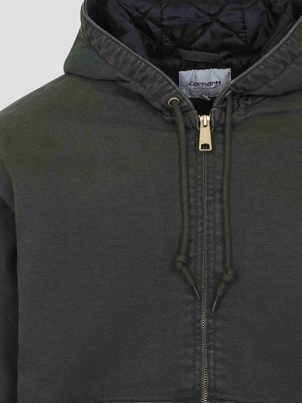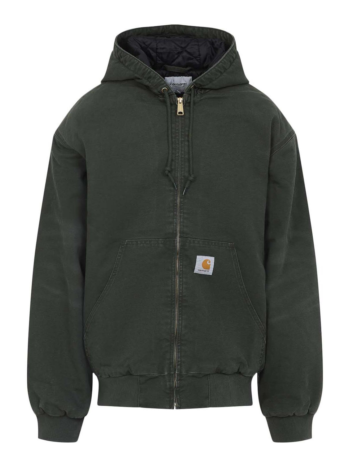 Carhartt wip olive green og active jacket pure olive green jacket tonal hood drawstring zipped patch logo side pockets dropped shoulders long sleeves ribbed cuffs and hem straight hem