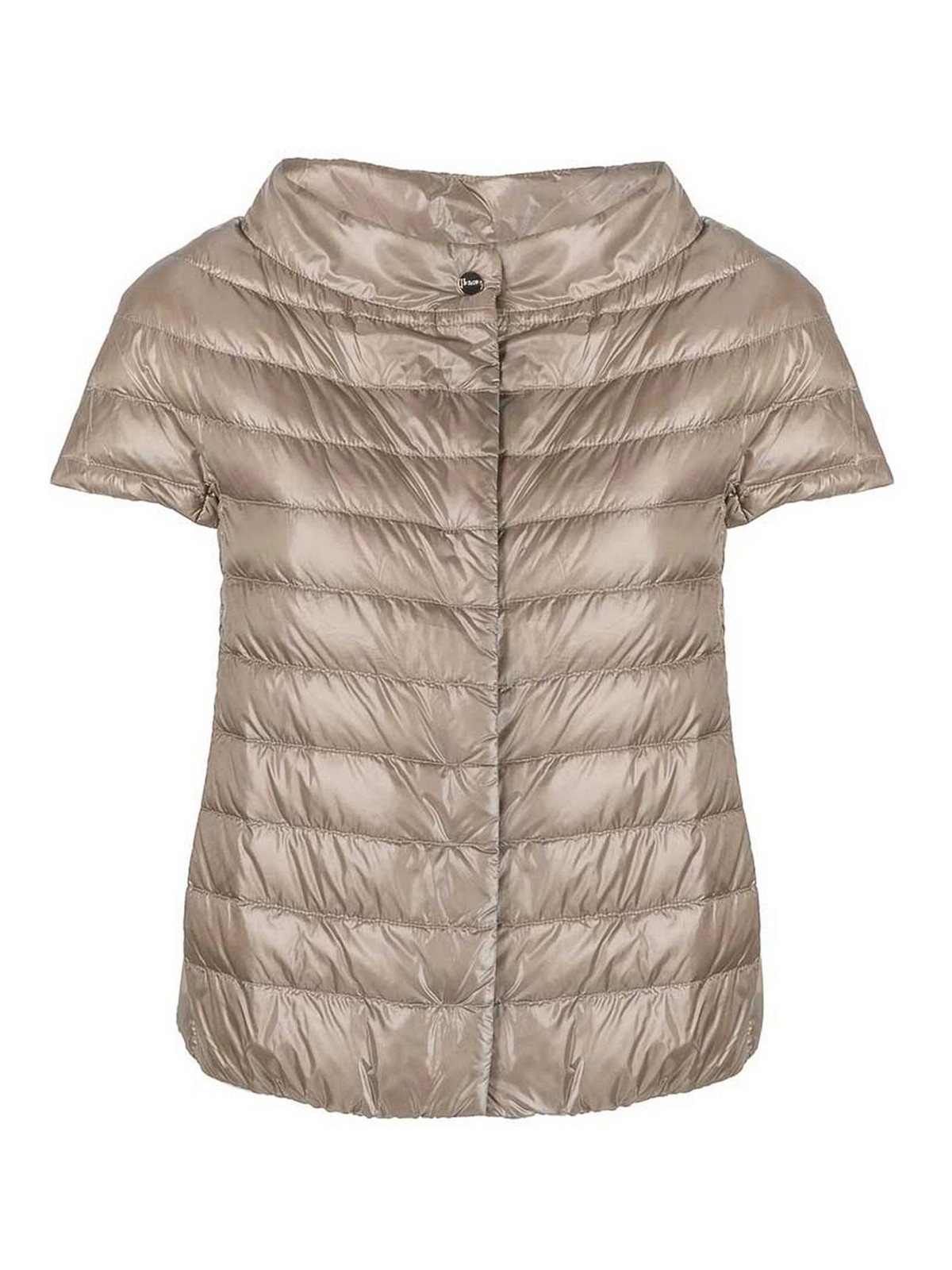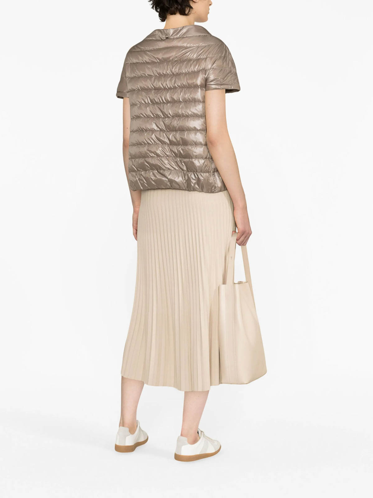Taupe brown down-feather filling quilted padded design round neck concealed press-stud fastening short sleeves two side welt pockets straight hem
