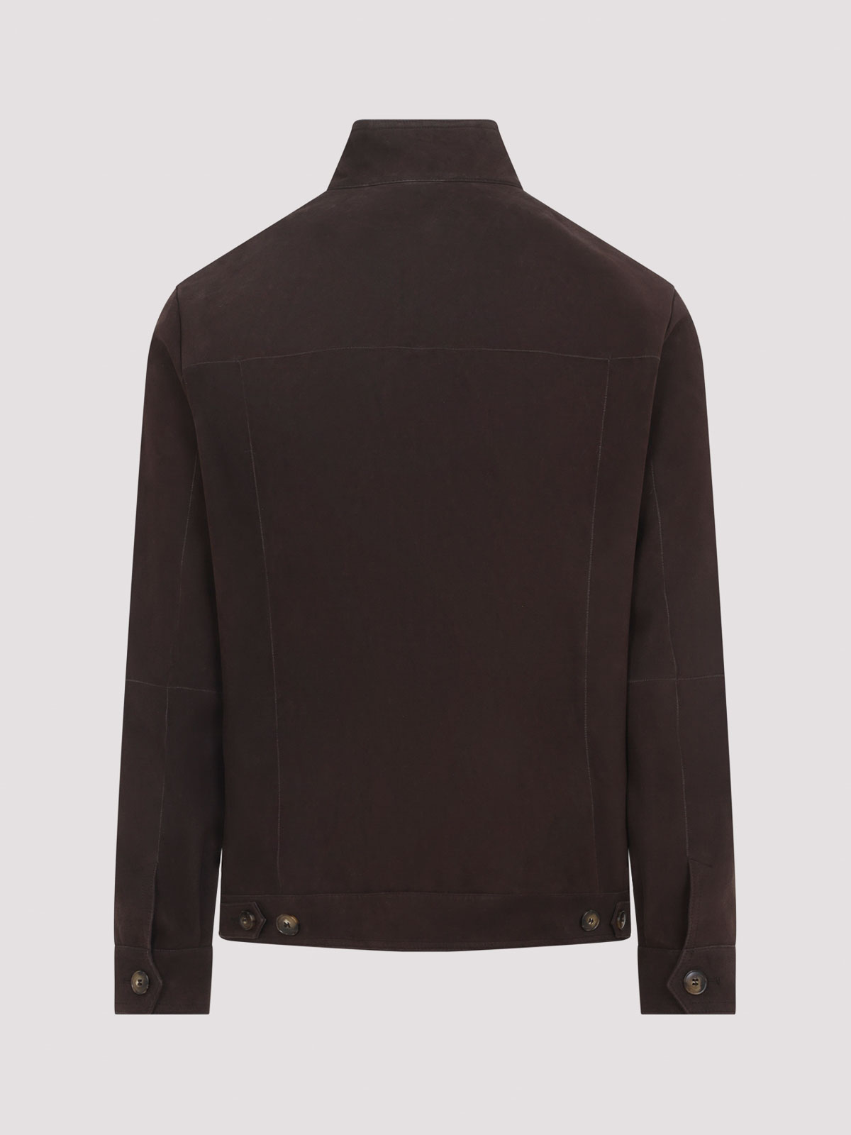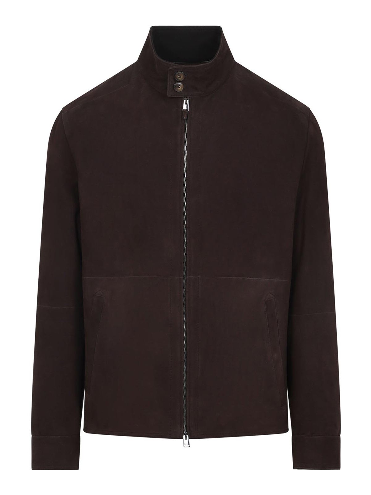 Canali brown lamb leather outerwear jacket. pure brown lamb leather jacket, stand-up collar with buttoned fastening, front zipped fastening, side slit pockets, long sleeves, buttoned cuffs, back buttoned straps on the hem, straight hem.