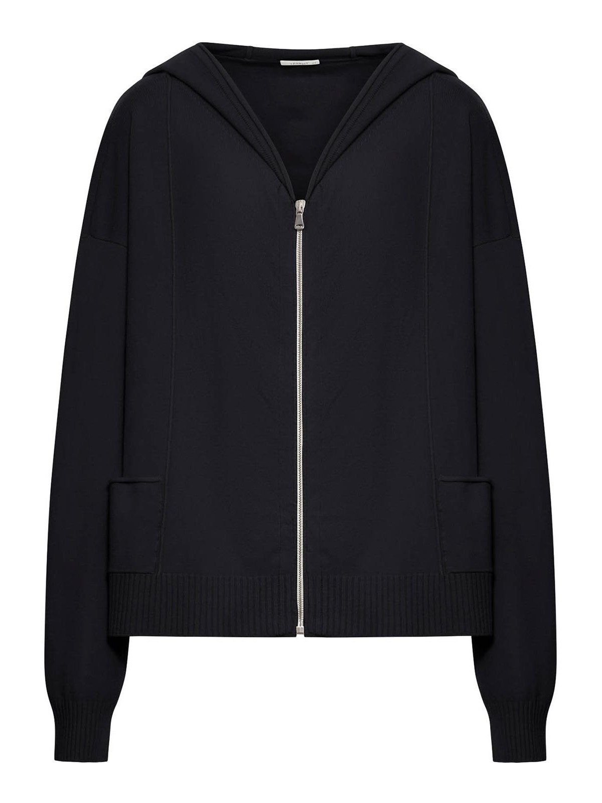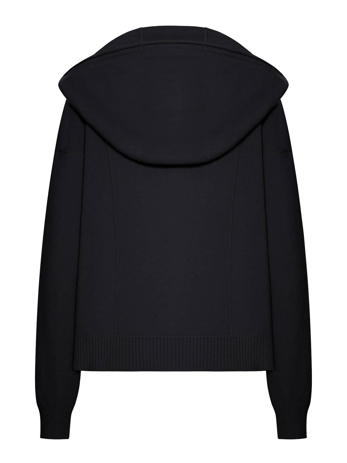 Hood, plain knit blend, patch pockets, long sleeves, ribbed cuffs and hem, exposed buttons, garment, dyed, unlined, oversized fit, color black