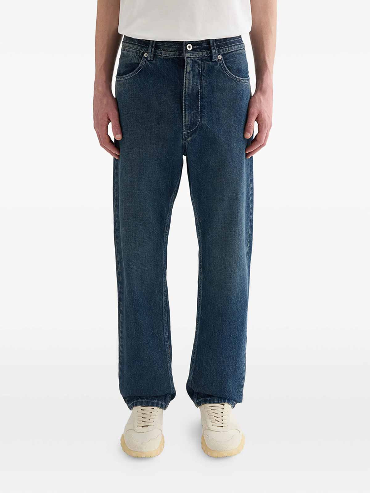 Denim blue multi-stitched waistband five pockets slit coin pocket button and zip closure embossed logo patch