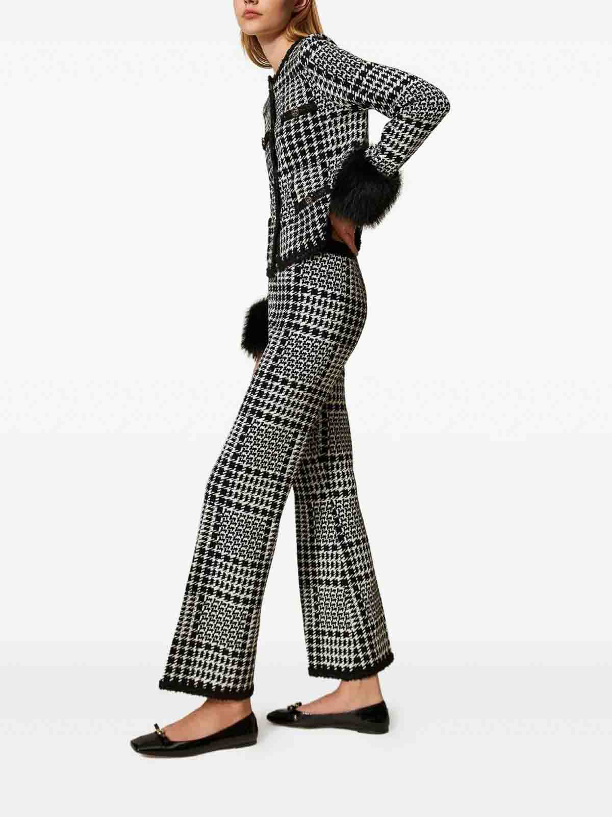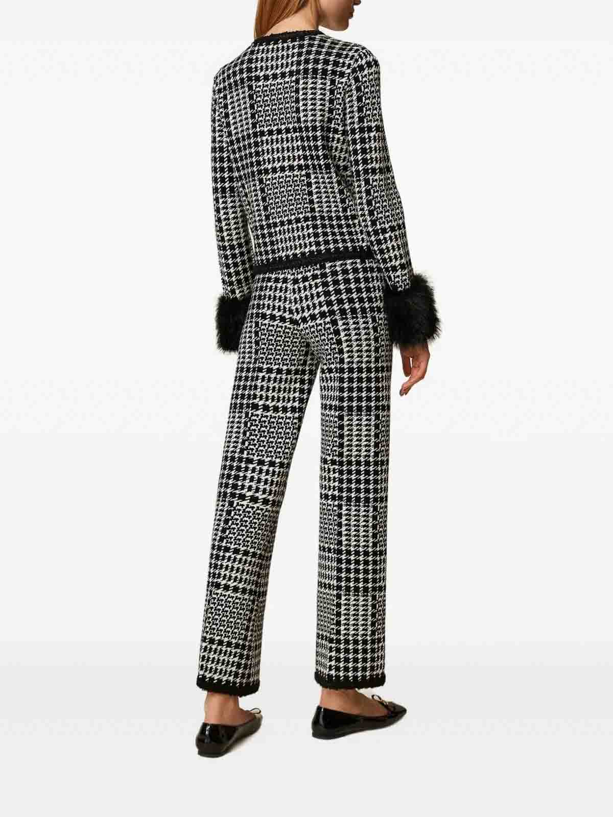 Women's trousers characterized by a graphic check pattern and a modern line. The Neve and Nero color contrast enhances the contemporary style of the garment.