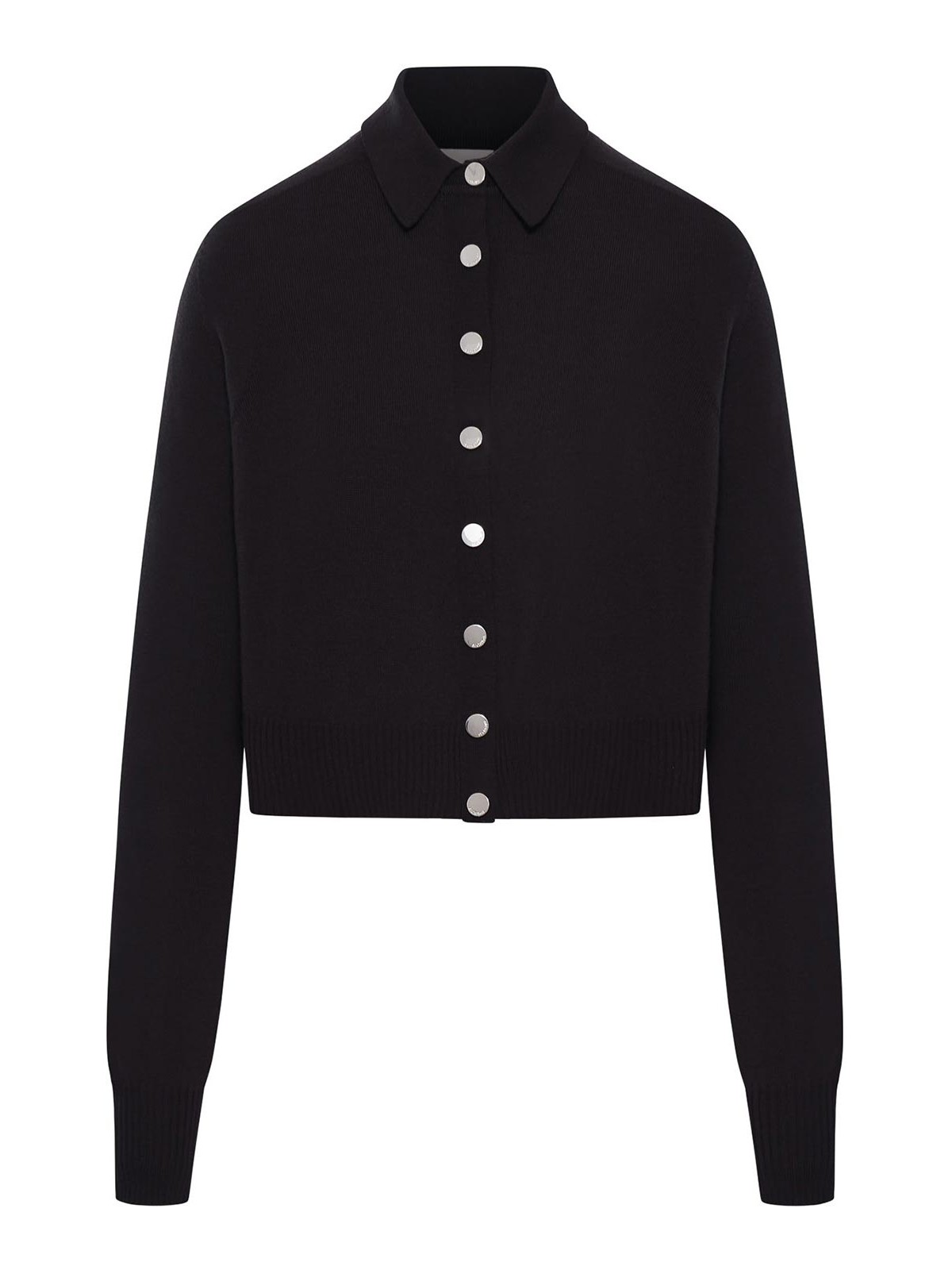 Pure cardigan, soft fit with feminine line, custom button, ribbed knit edges and cuffs, - color black