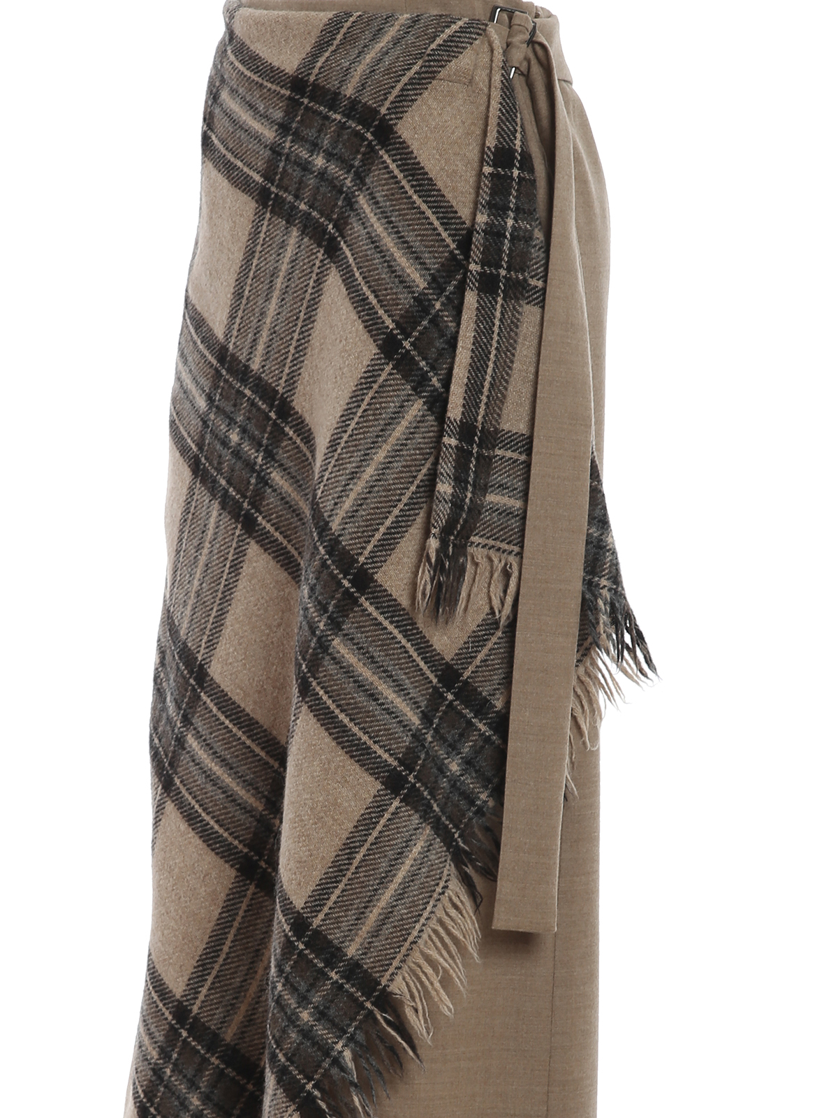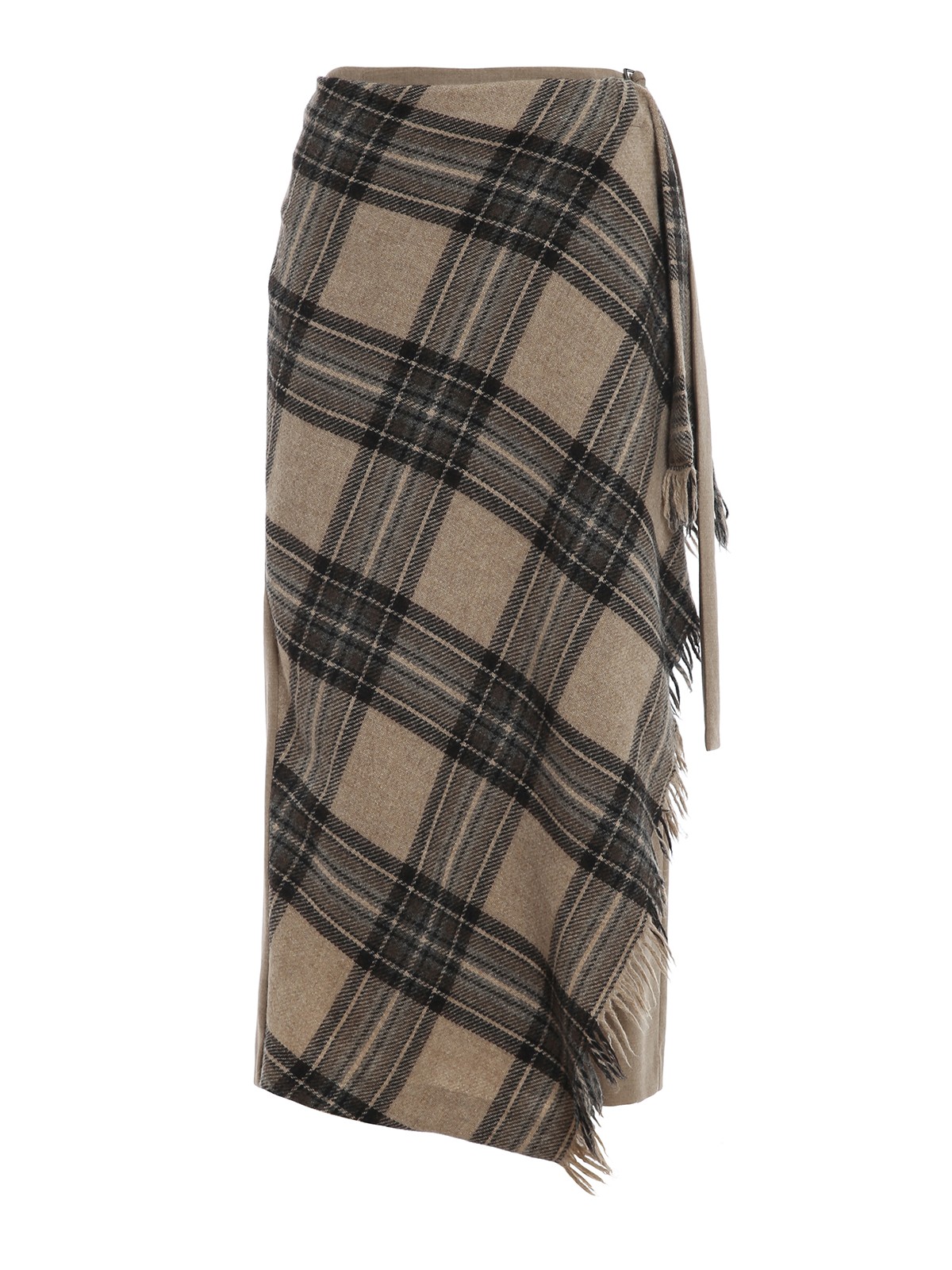 Stretch wool flannel skirt featuring flared design, check print front panel, wrap closure, matching belt and fringed edge. Lined.