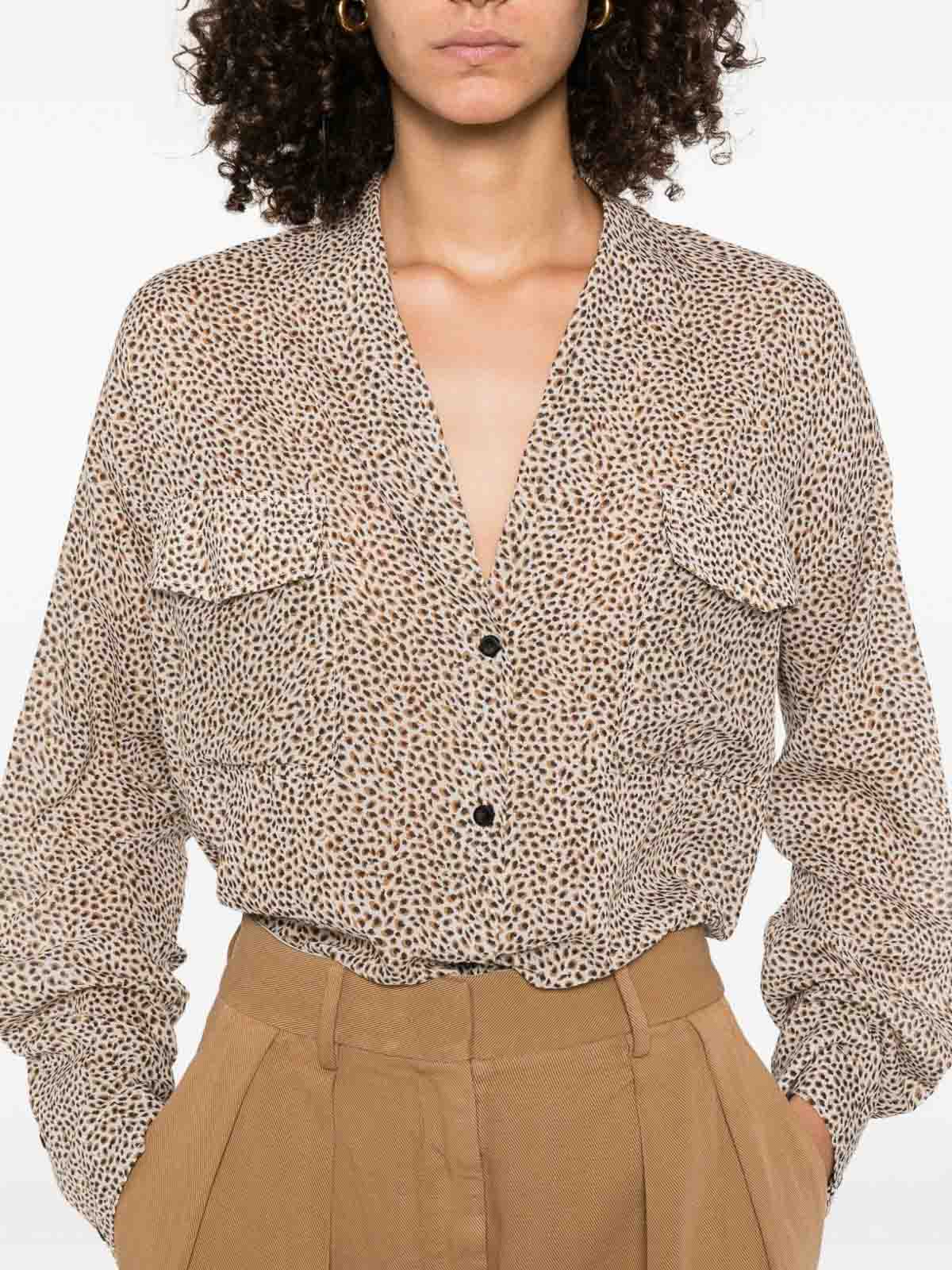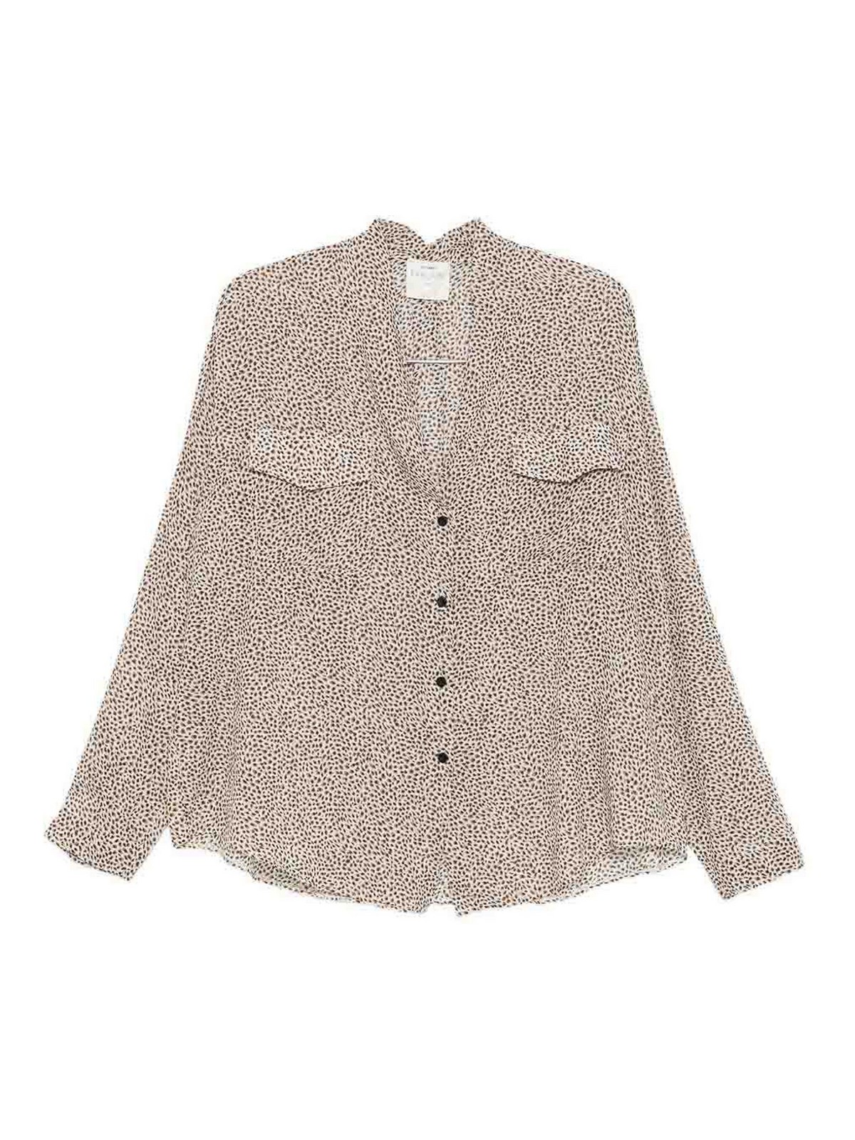 Forte forte's modern 'my shirt' shirt, crafted in a refined hazelnut brown with a polka dot pattern, features a collarless design, patch pockets, long sleeves, and a button closure for a casual yet refined style, forte forte, 'my shirt' shirt, hazelnut brown, polka dot pattern, long sleeves, button closure, collarless design, patch pockets