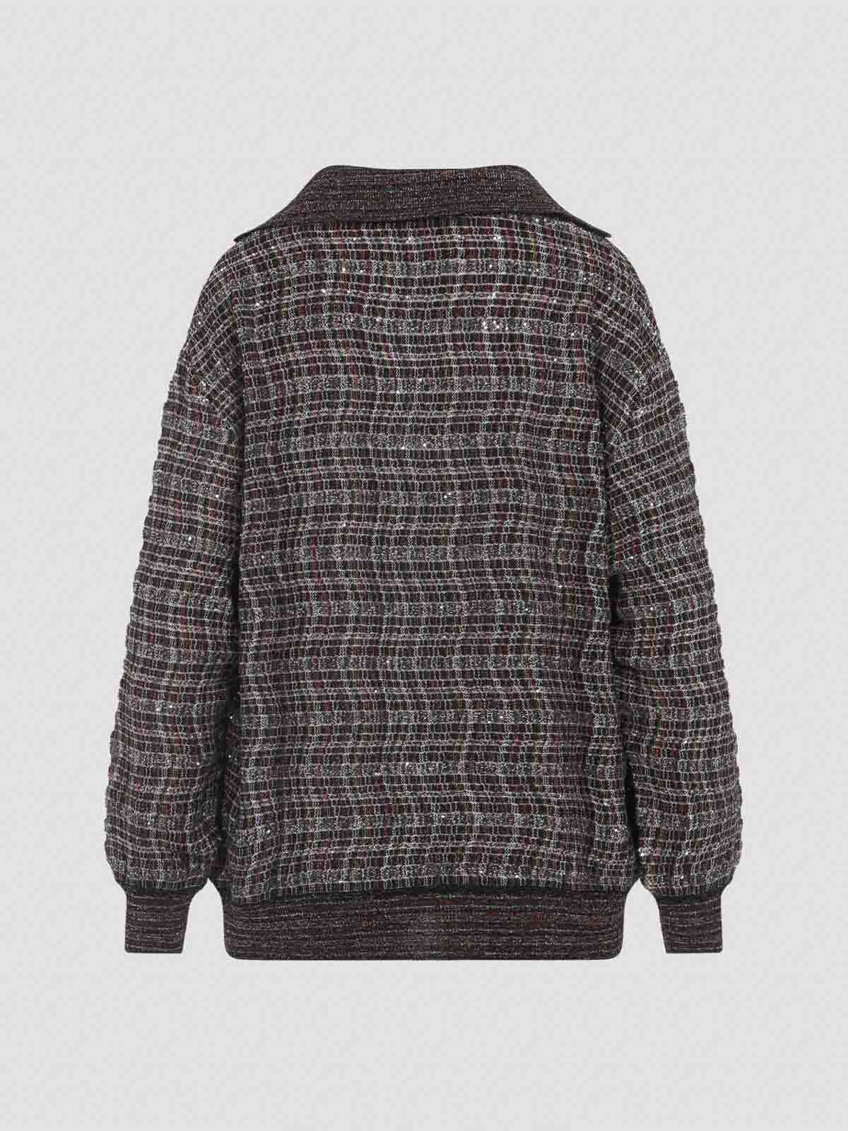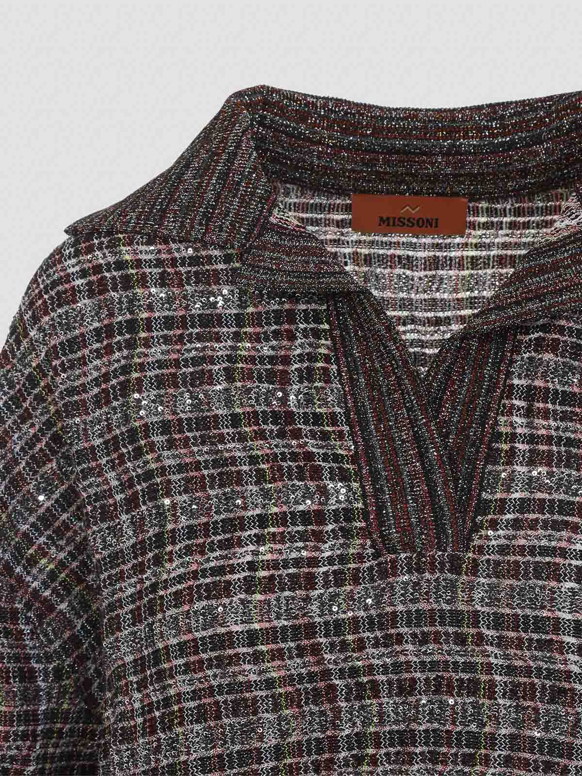 Missoni pink polo. crafted in viscose, polyamide, metallic, wool, cotton and polyester blend. polo collar, dropped shoulders, long sleeves, ribbed cuffs and hem, straight hem. pink and brown geometric pattern all-over.