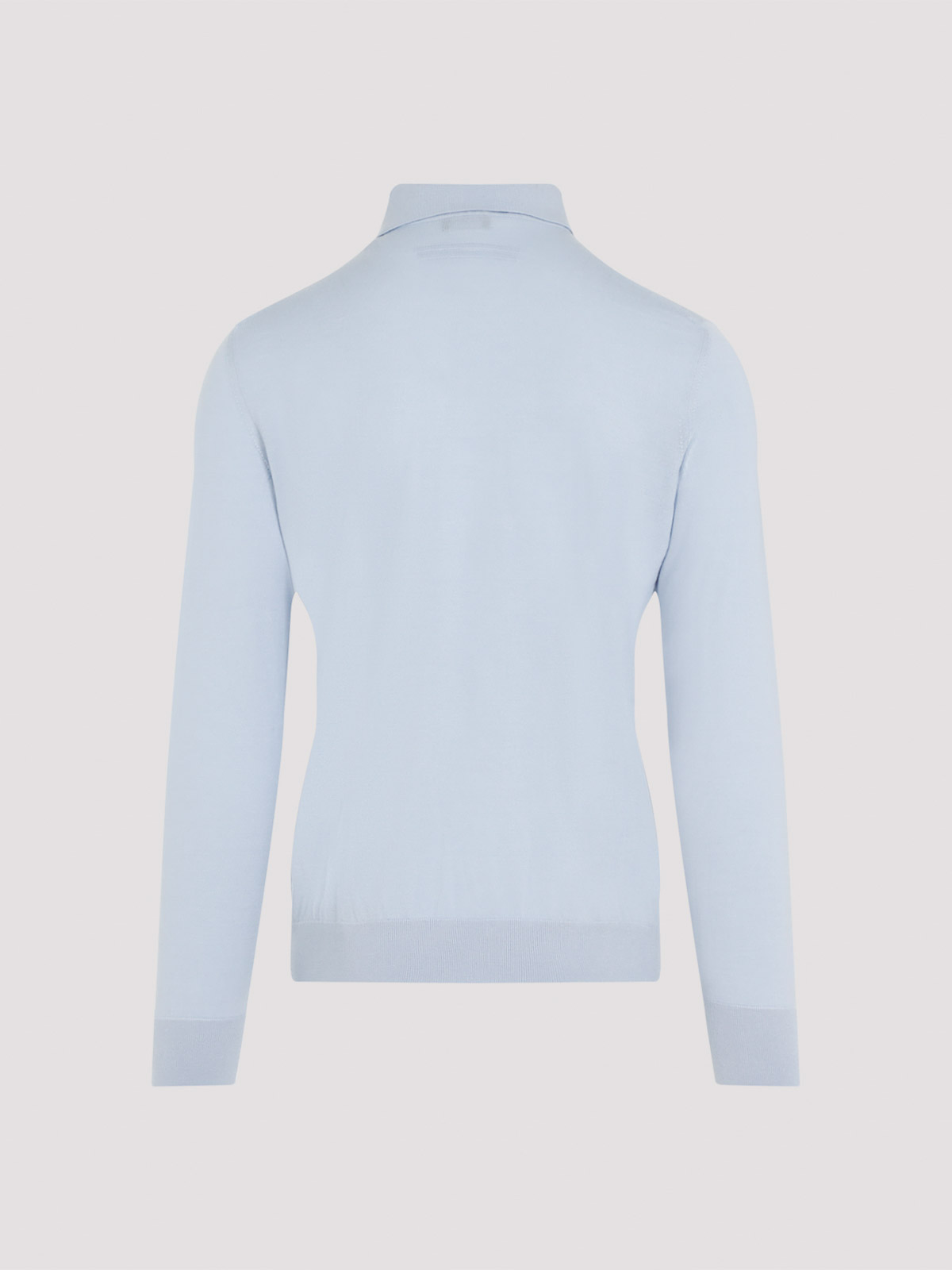 Zegna light blue cashmere polo. crafted in cashmere and silk mulberry blend. classic polo collar, long sleeves, ribbed cuffs and hem, straight hem.