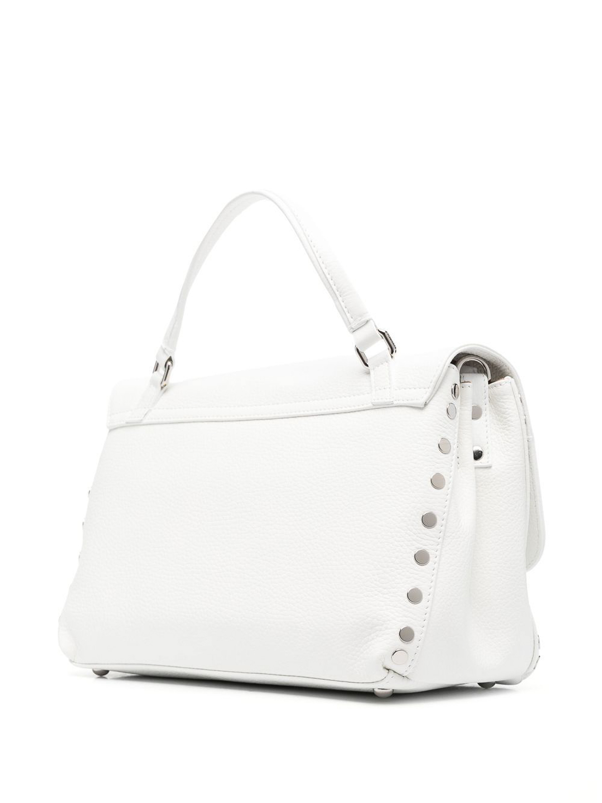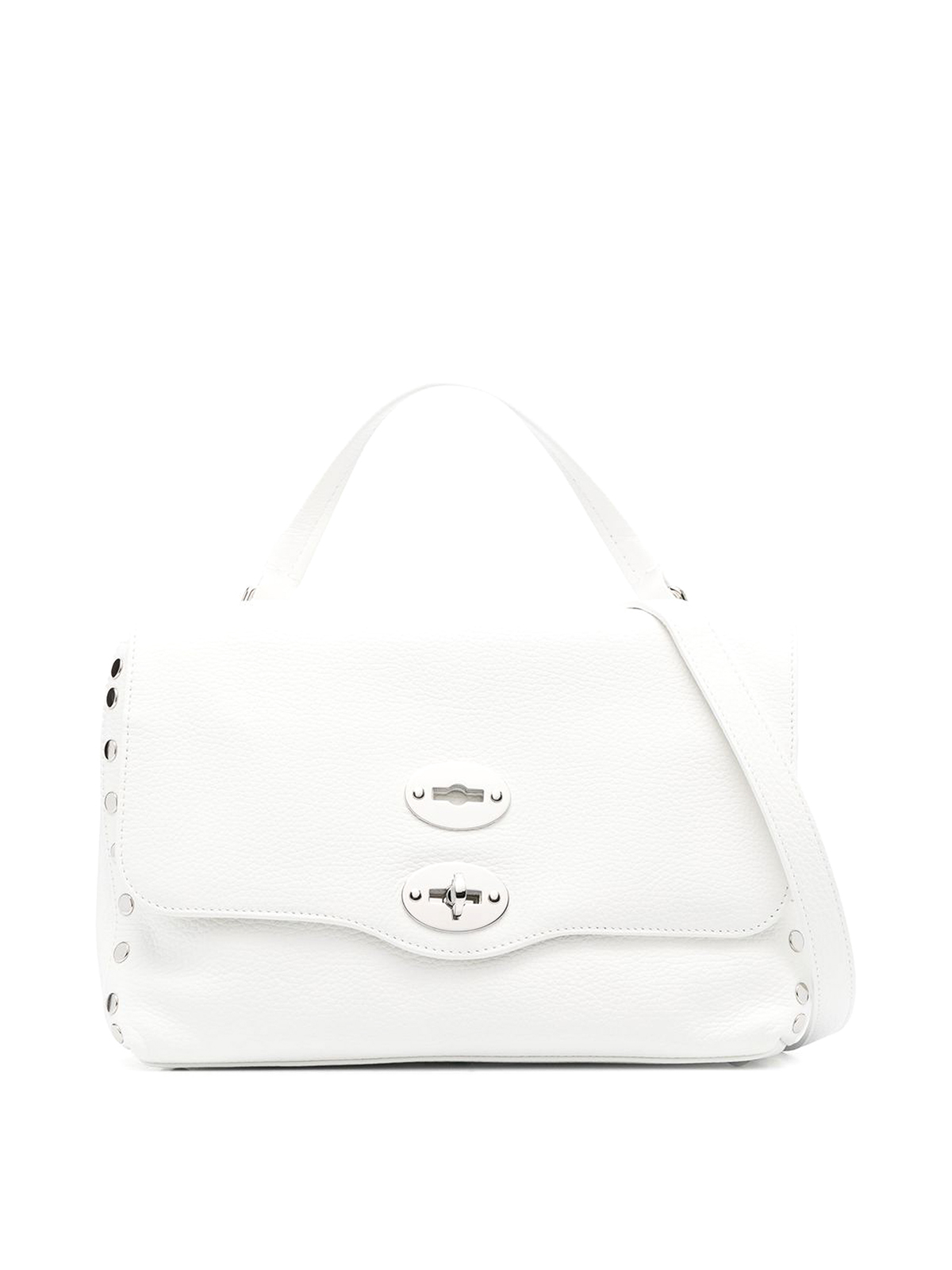 Postina leather tote bag from zanellato featuring white calf leather grained texture silver-tone hardware silver-tone stud detailing front flap closure twist-lock closure single top handle adjustable shoulder strap partitioned compartment internal zip-fastening pocket and internal logo patch