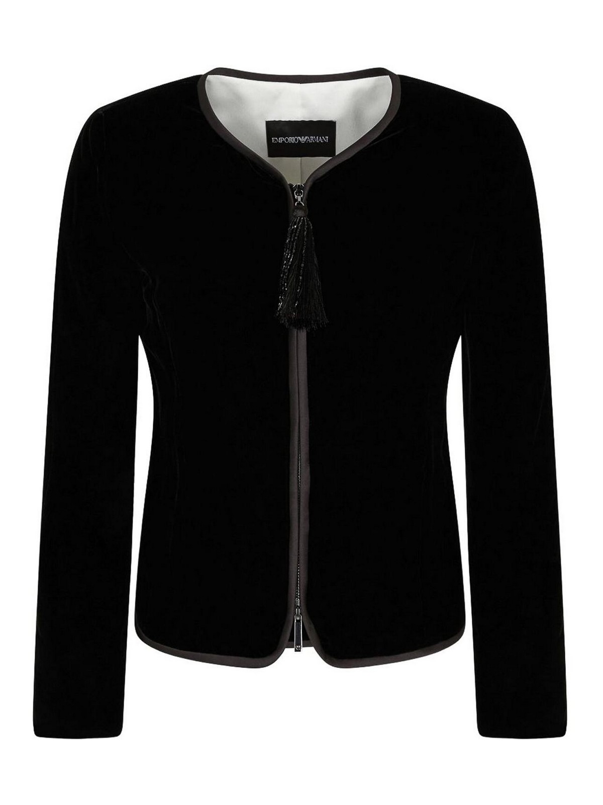 Black velvet texture front zip fastening satin trim tassel pull cropped sleeves