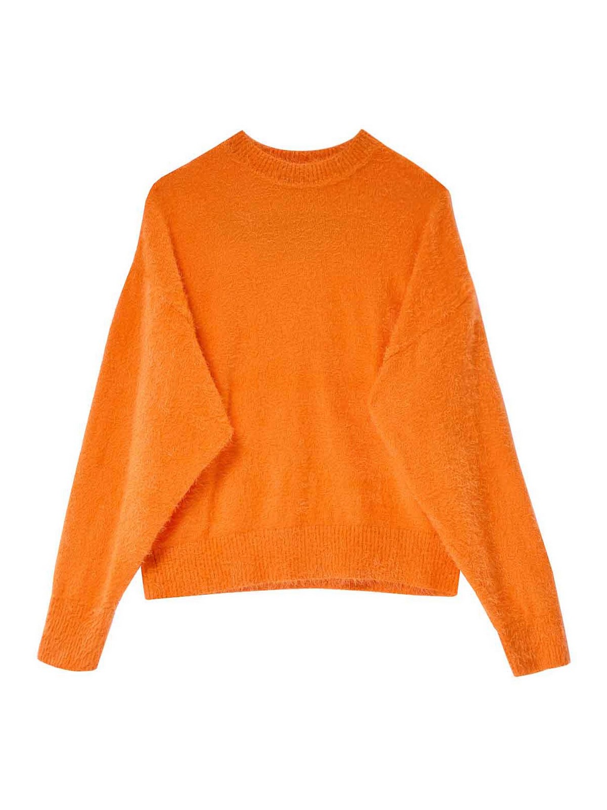 Cloud sweater in orange. Moschino sweater with a soft, teddy-like finish, featuring a contrasting inlaid logo on the back and fine ribbed trim on the cuffs and hem. Soft texture, contrasting inlaid logo on the back, fine ribbed crew neck, cuffs, and hem. Color: Orange. 100% polyamide.