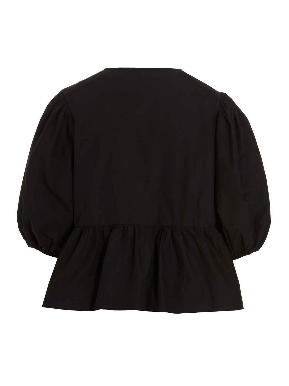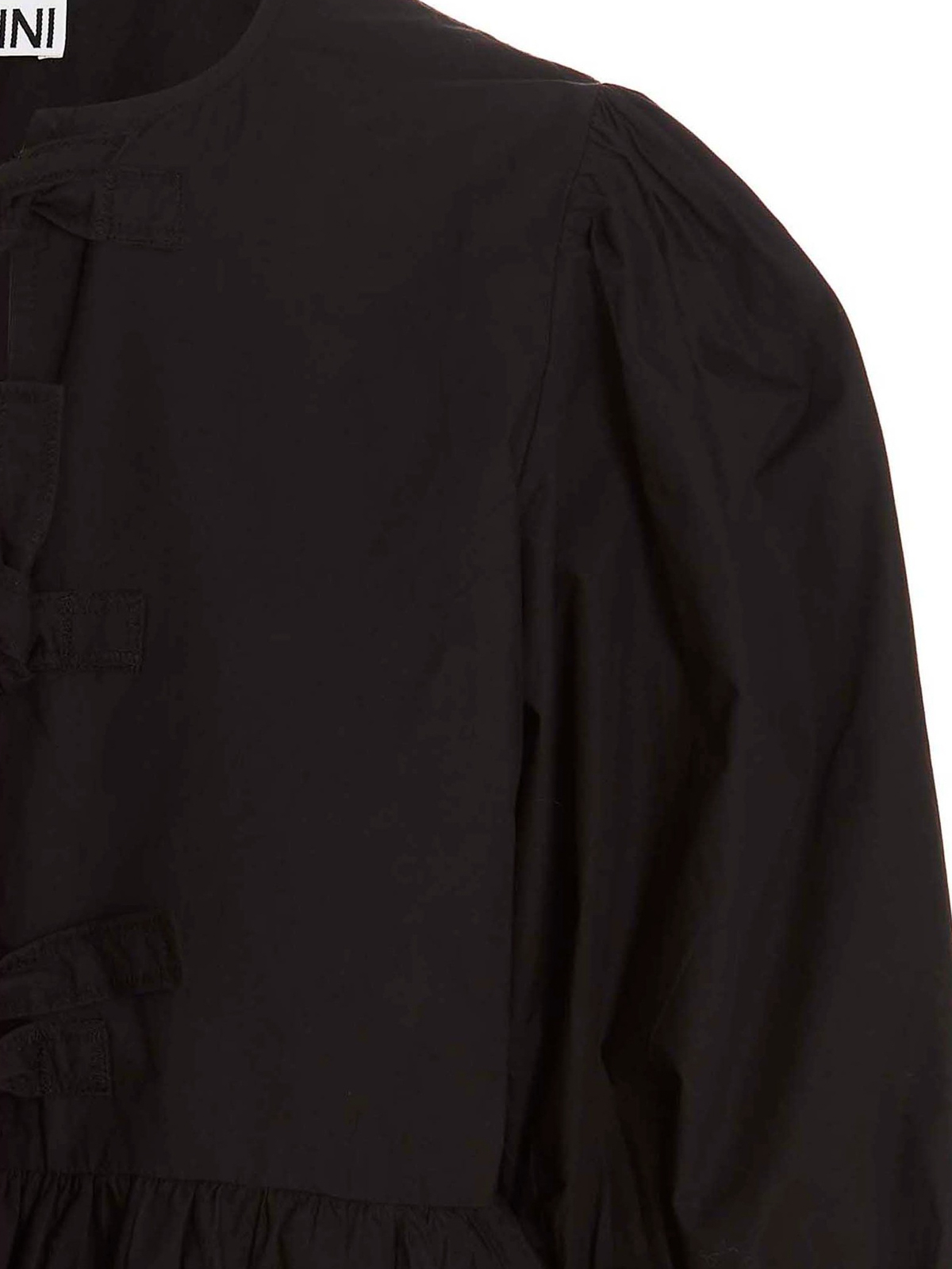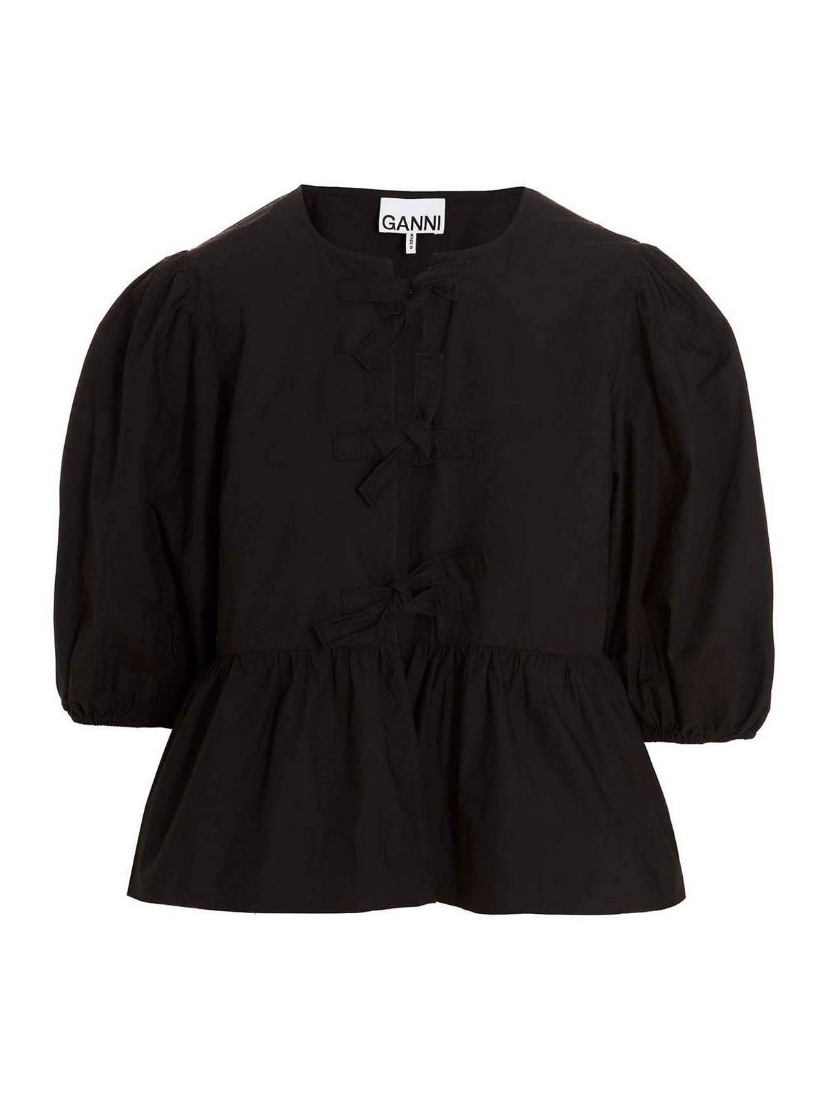 Cotton poplin bloin with front bow closure, crewneck, short puff sleeves and flounces on the bottom hemline.