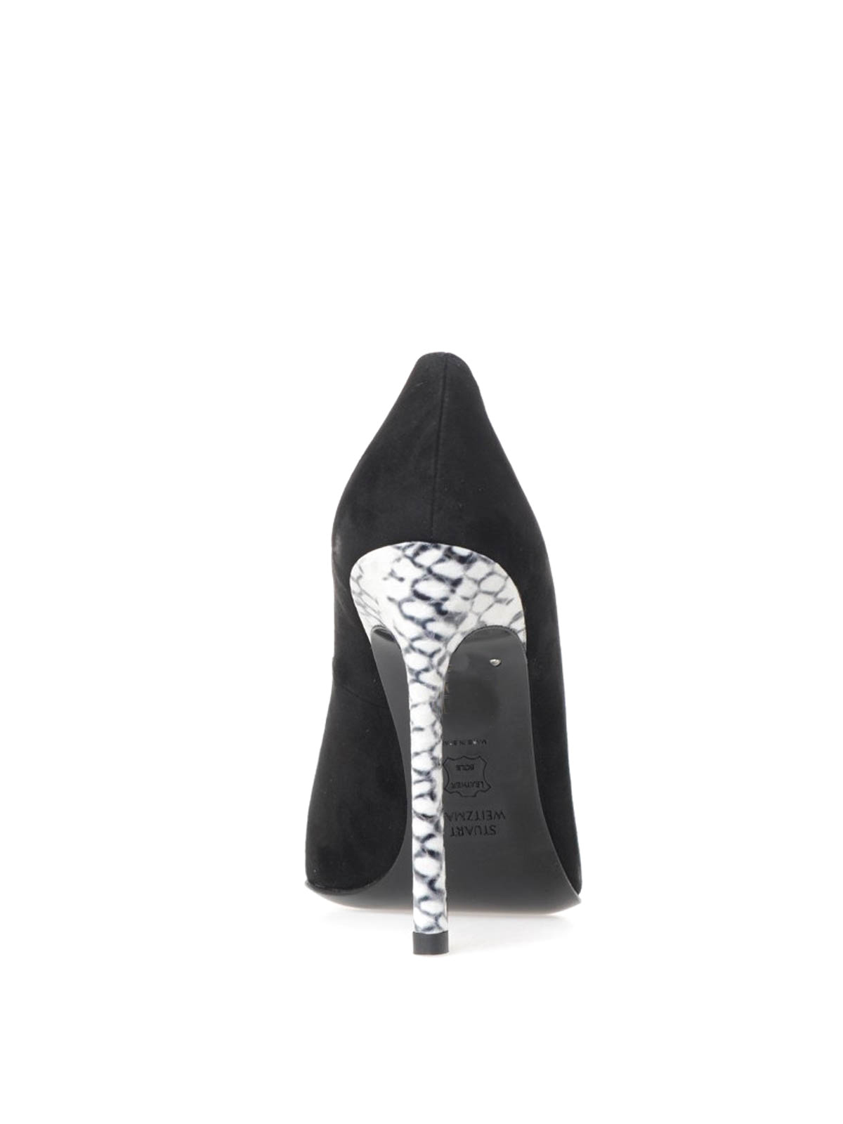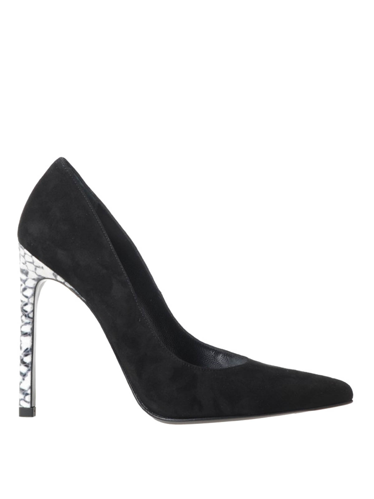 Suede pumps featuring pointed toe, python print stiletto heel and leather sole.