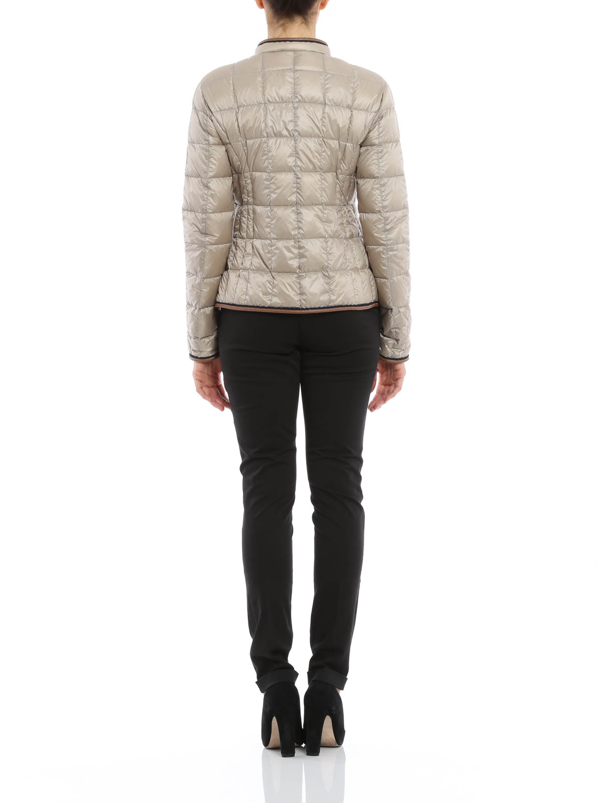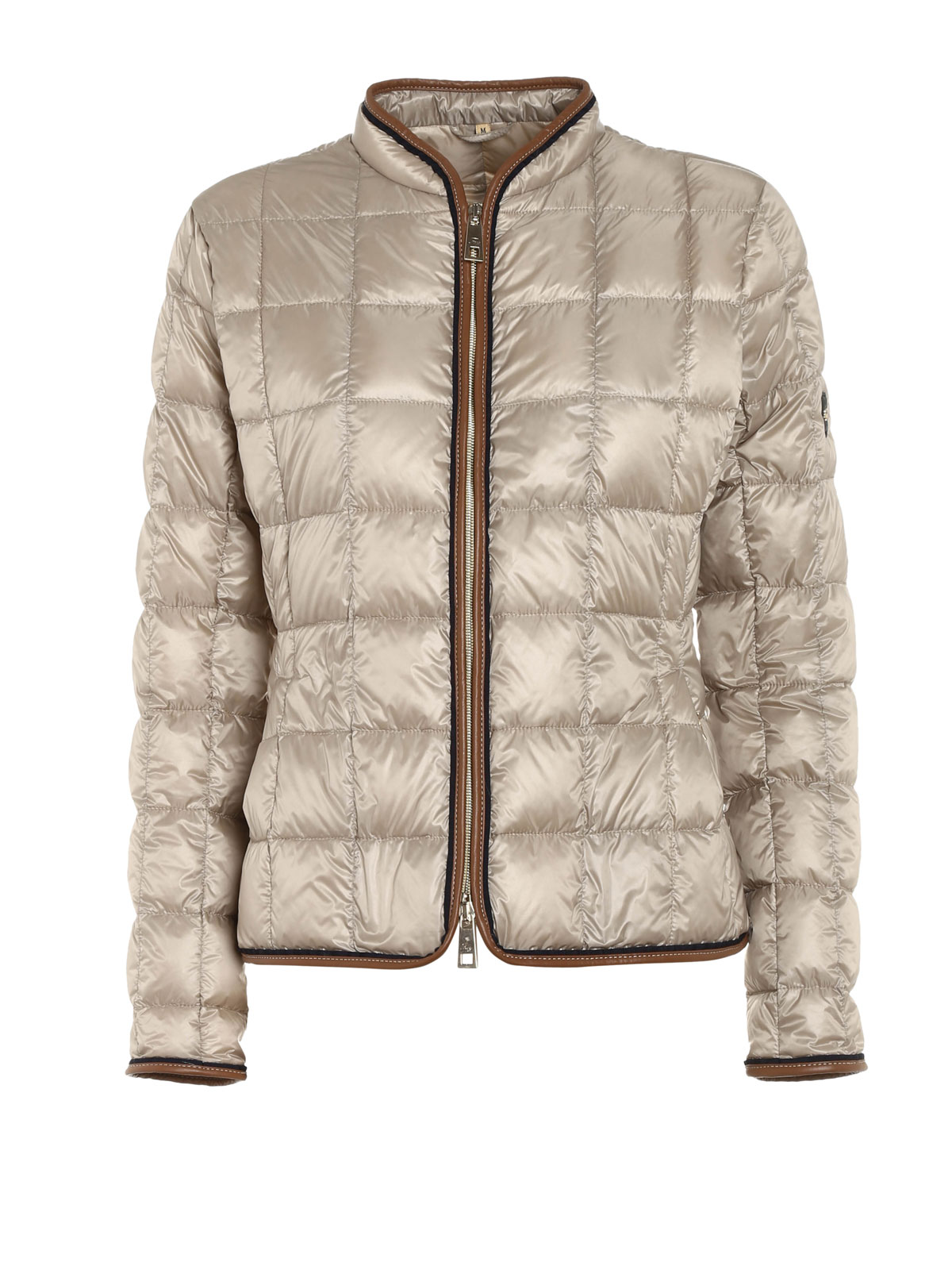 Ultralight semi-shiny nylon quilted down jacket featuring contrasting faux leather and grosgrain piping, concealed zip side pockets and zip fastening.