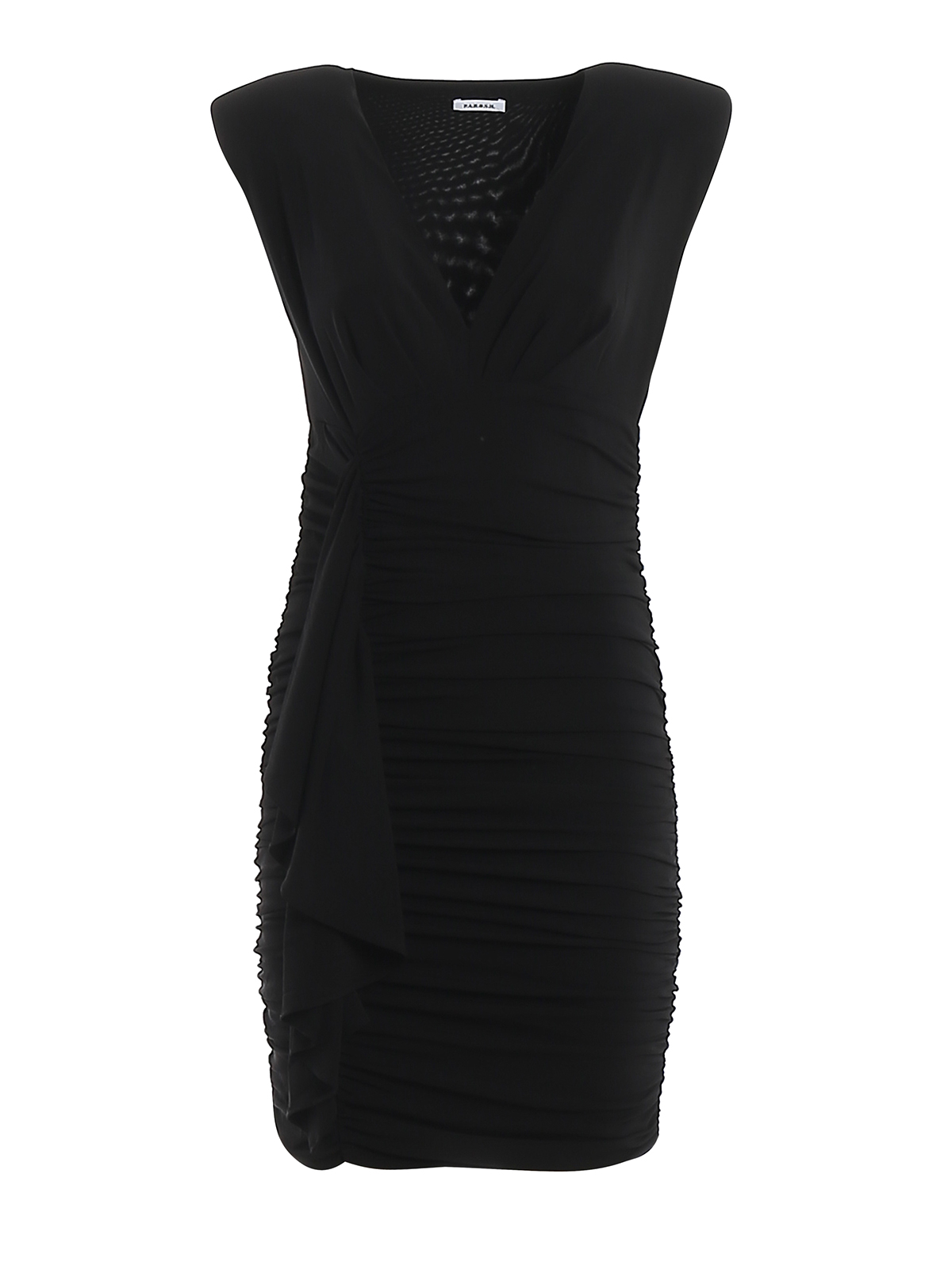 Crepe sleeveless asymmetric dress featuring V neck and draped detail.