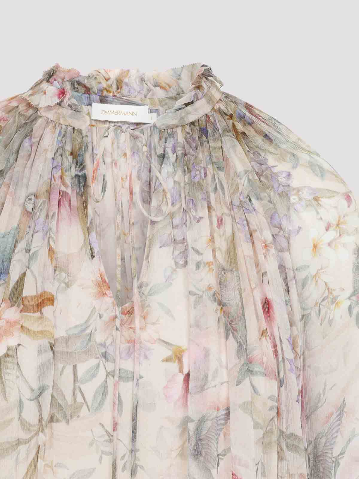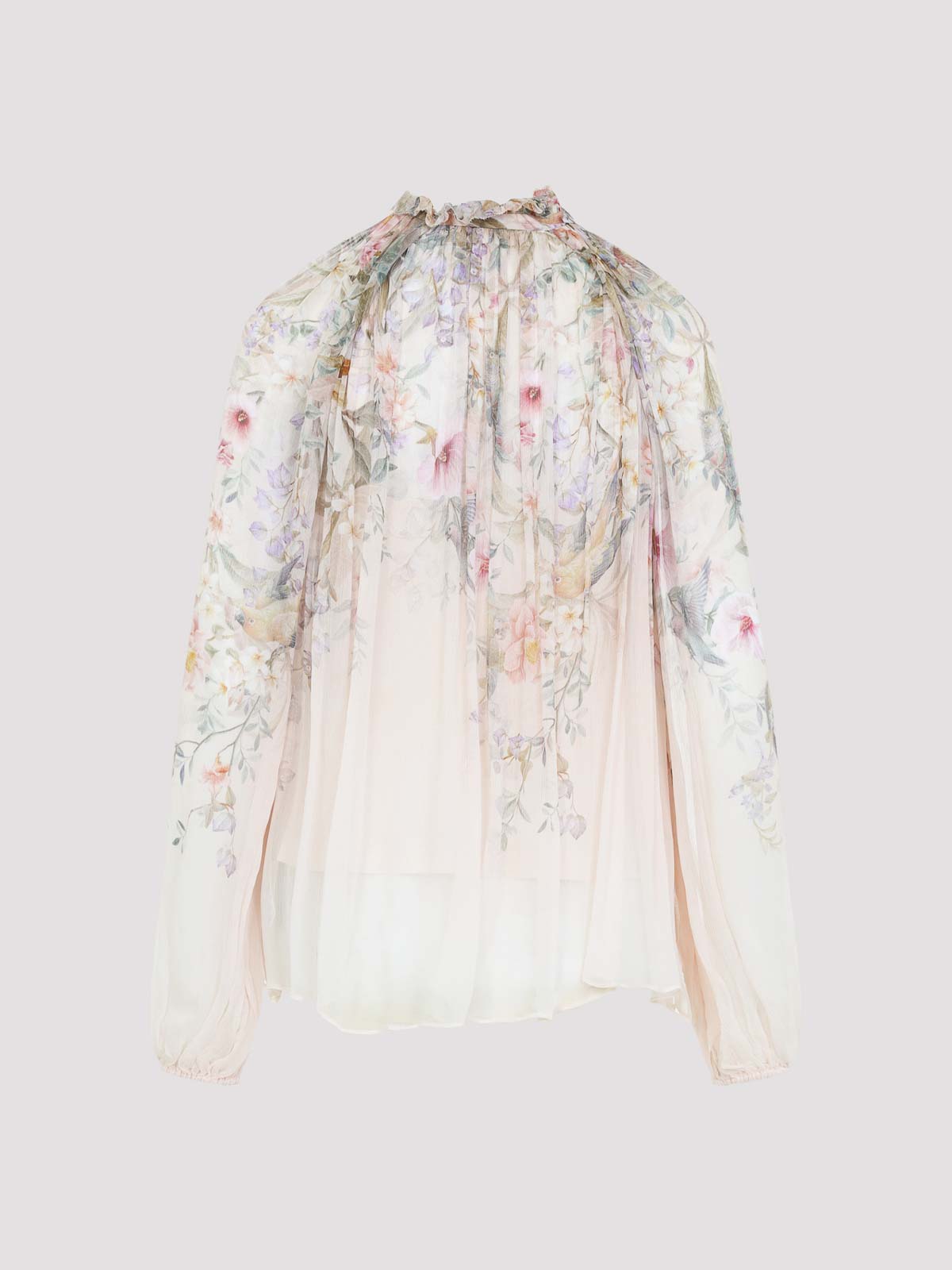 Zimmermann rebellion billow ivory viscose blouse. crafted from ivory viscose, signature floral print all over, standing collar, v-neckline with self-tie fastening, gathered detailing at the top, long balloon sleeves, elasticated cuffs, relaxed fit.