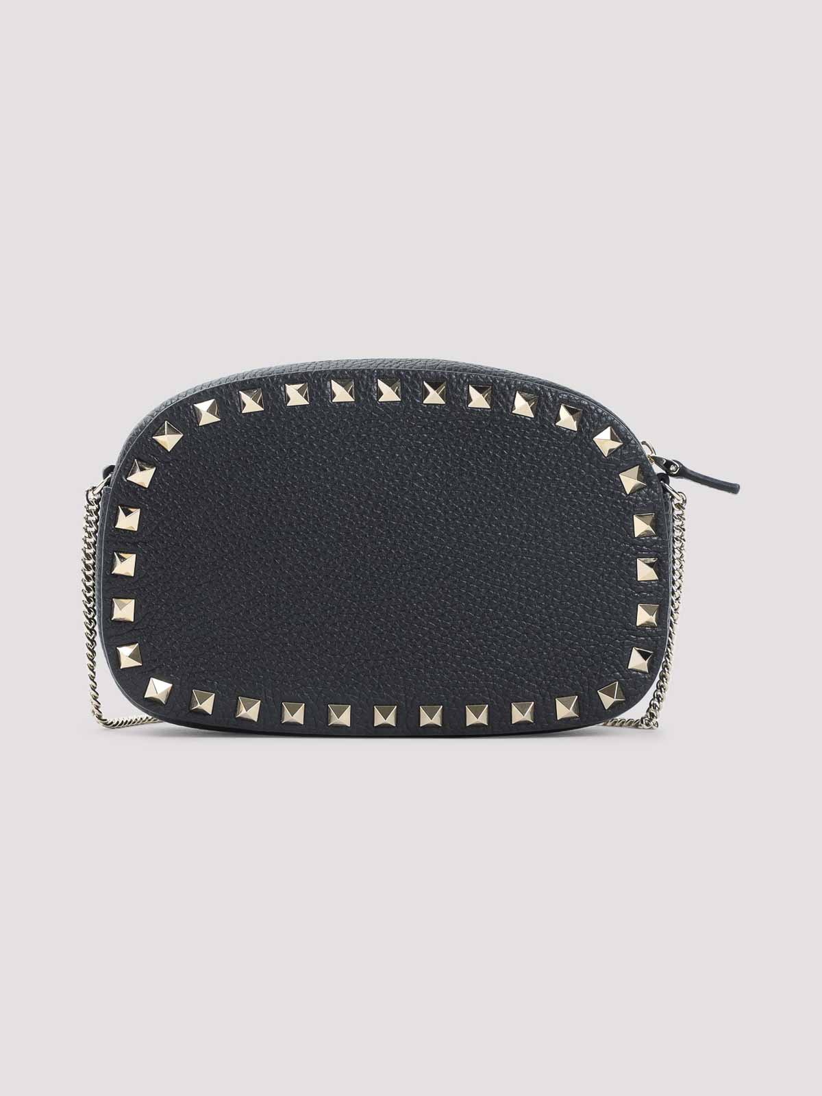 Valentino garavani black calf leather rockstud mini bag. pure black calf leather bag, top zipped fastening, front and back silver-tone studded details, silver-tone chain metallic shoulder strap, one main compartment.