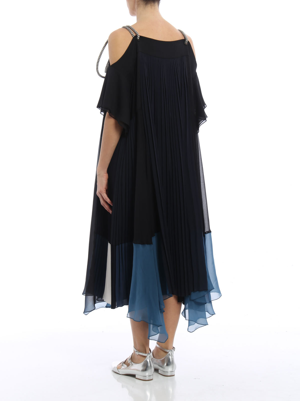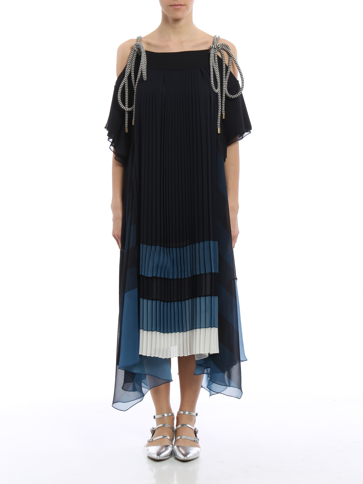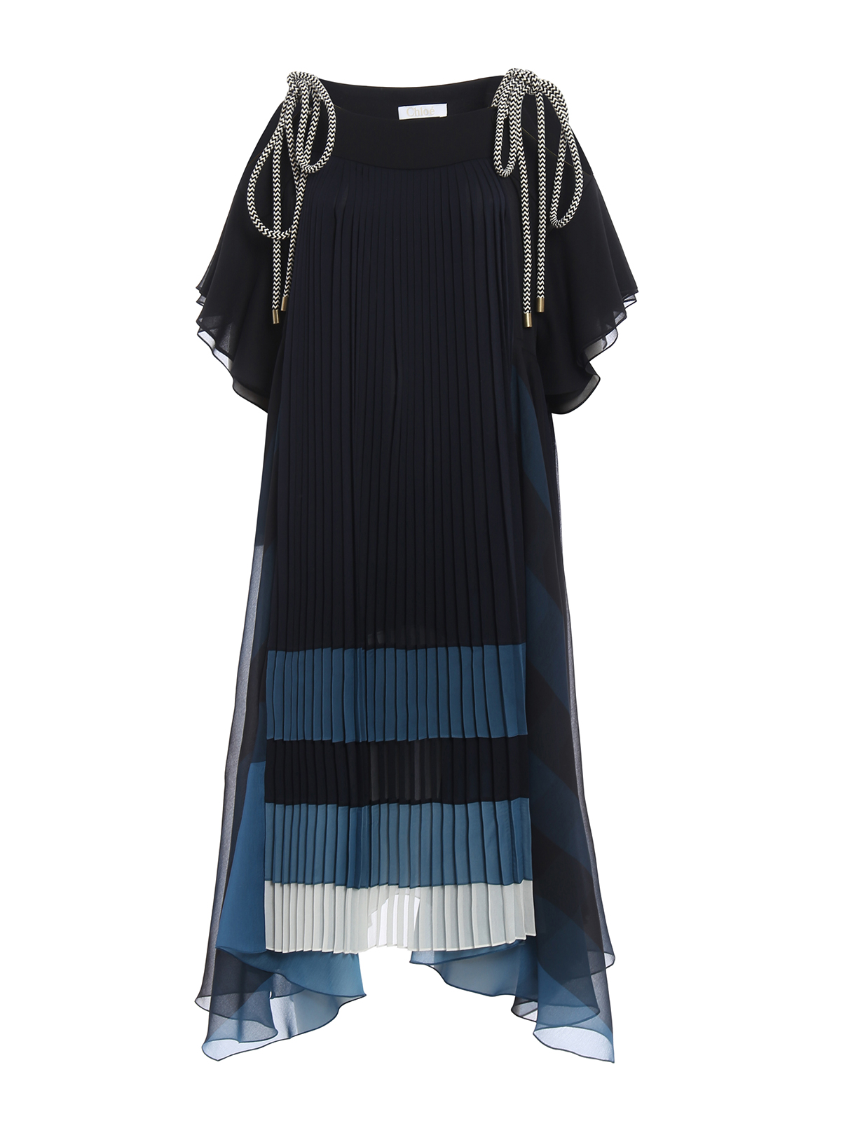 Inspired by the nautical attitude, this pleated georgette dress features bicolour rope adjustable straps, flounced sleeves and fluttering longer side panels that create movement. Lined.