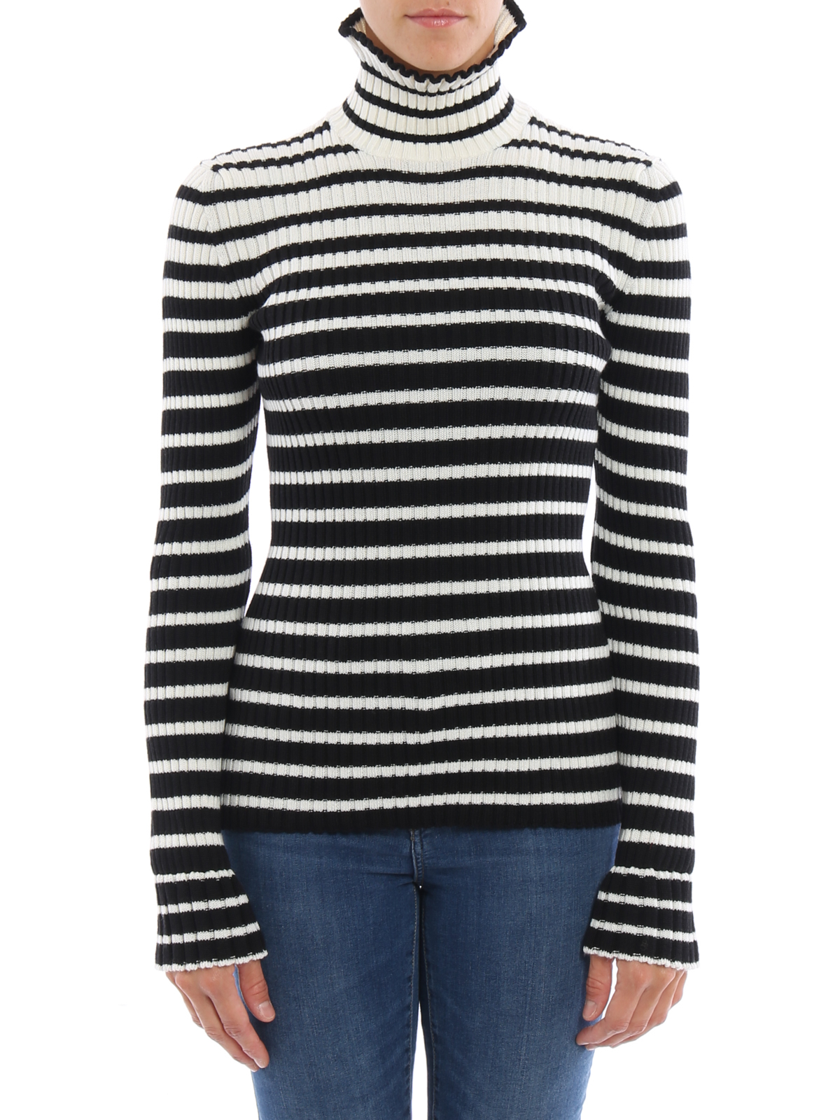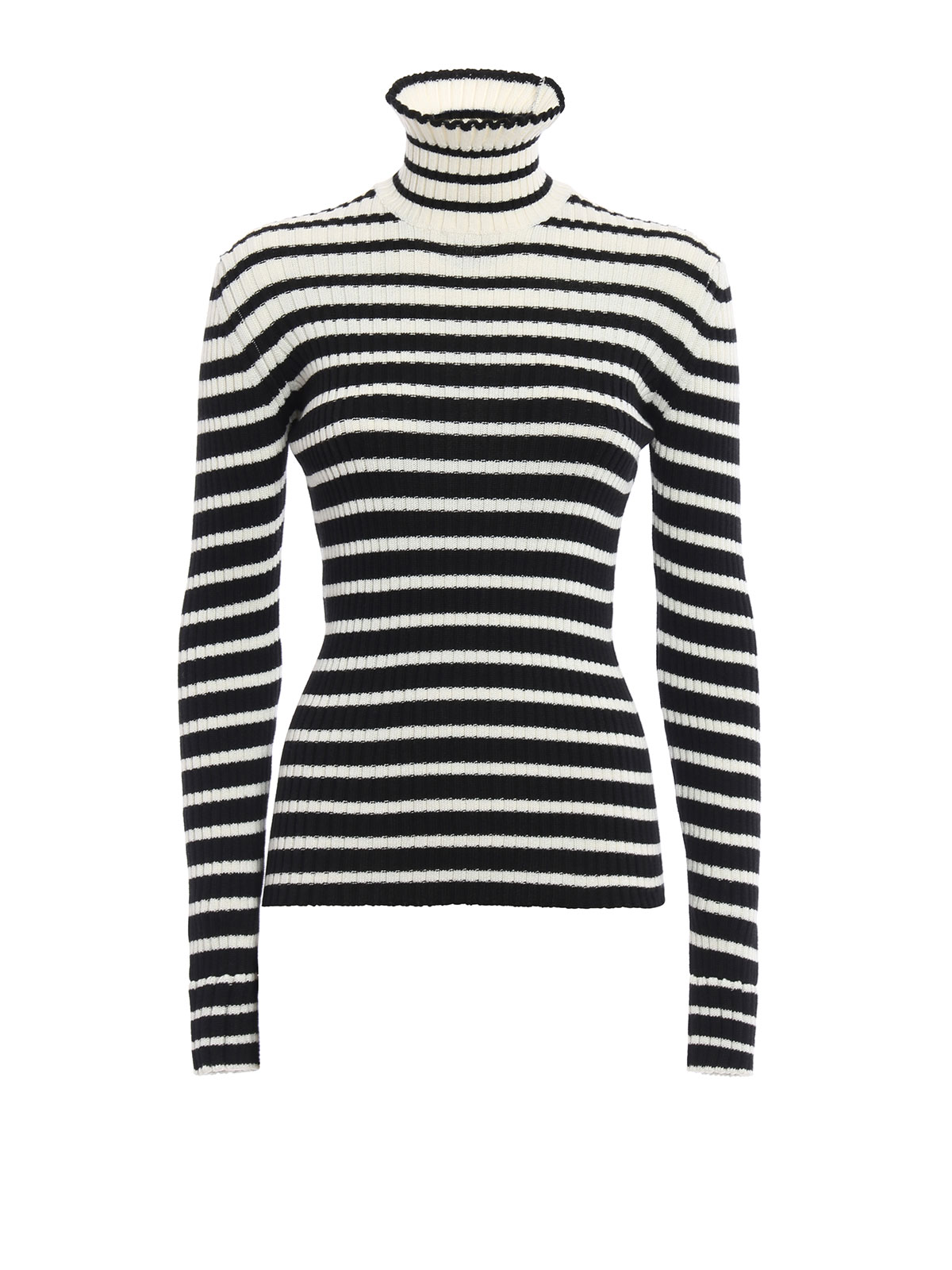 Rib knitted wool blend turtleneck detailed with striped pattern, ruched collar and elasticated cuffs.