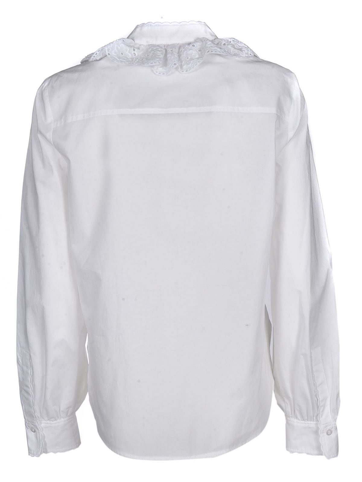Cotton poplin shirt Color: white Mandarin collar Long sleeve Cuffs with buttons Curved hem Front ruffle inserts Front buttons fastening