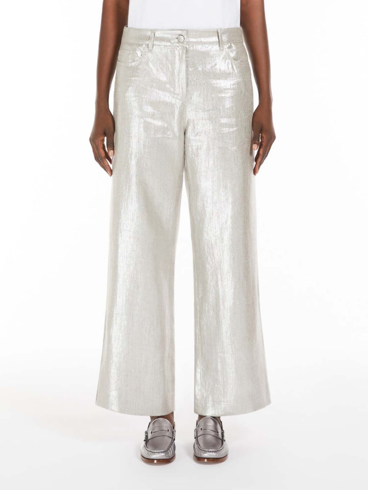 Malika trousers; 100% linen; Pantalone 5 pockets with a straight line, made of pure linen plated canvas. The model completed by belt passers -by, tinker and pockets applied on the back. Covered zip closure and nail button.