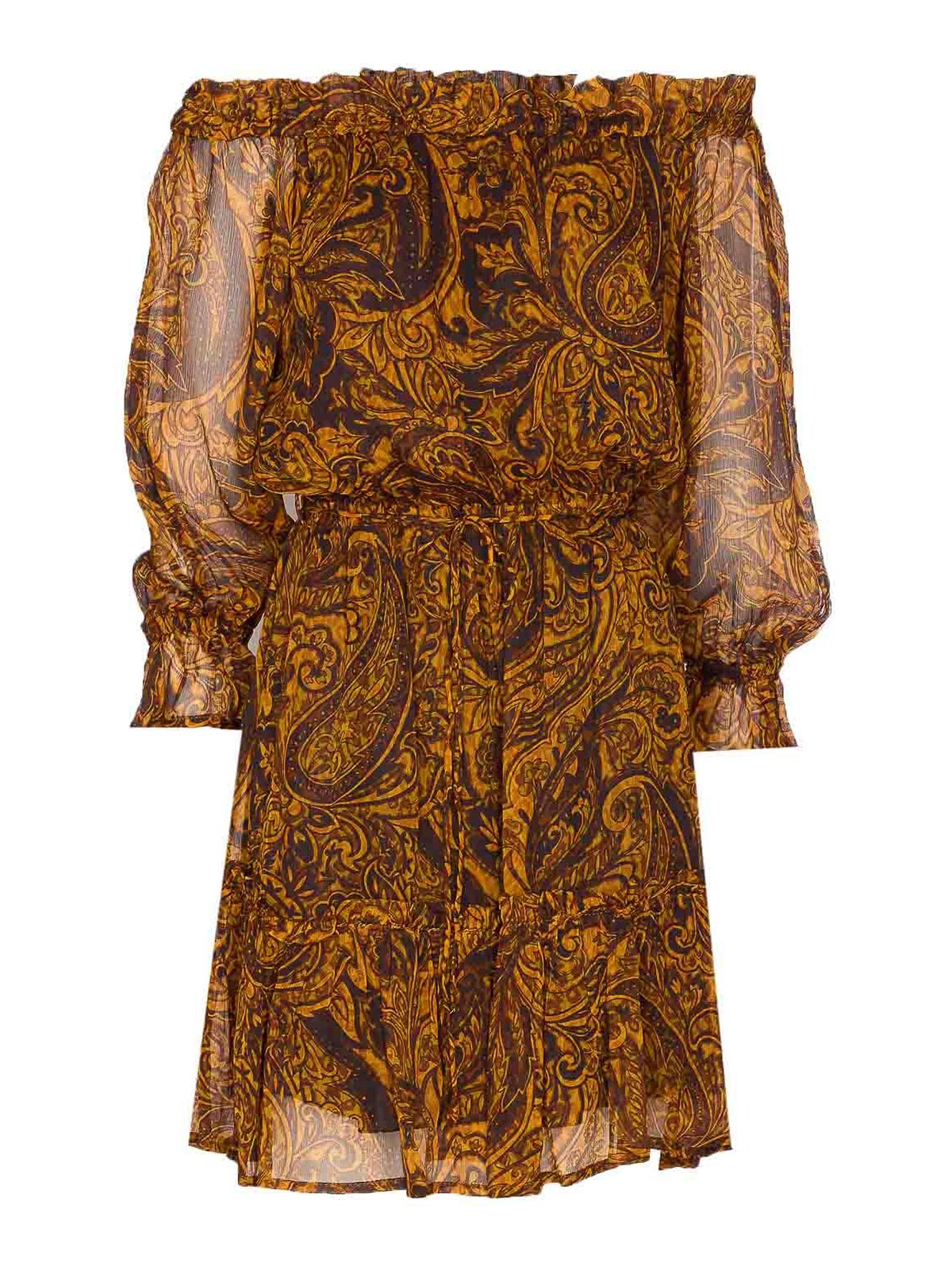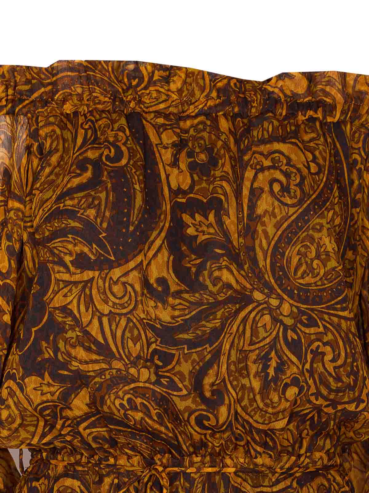 Pinko black and orange mini dress, paisley print, elasticized boat neck, belt detail, full gown