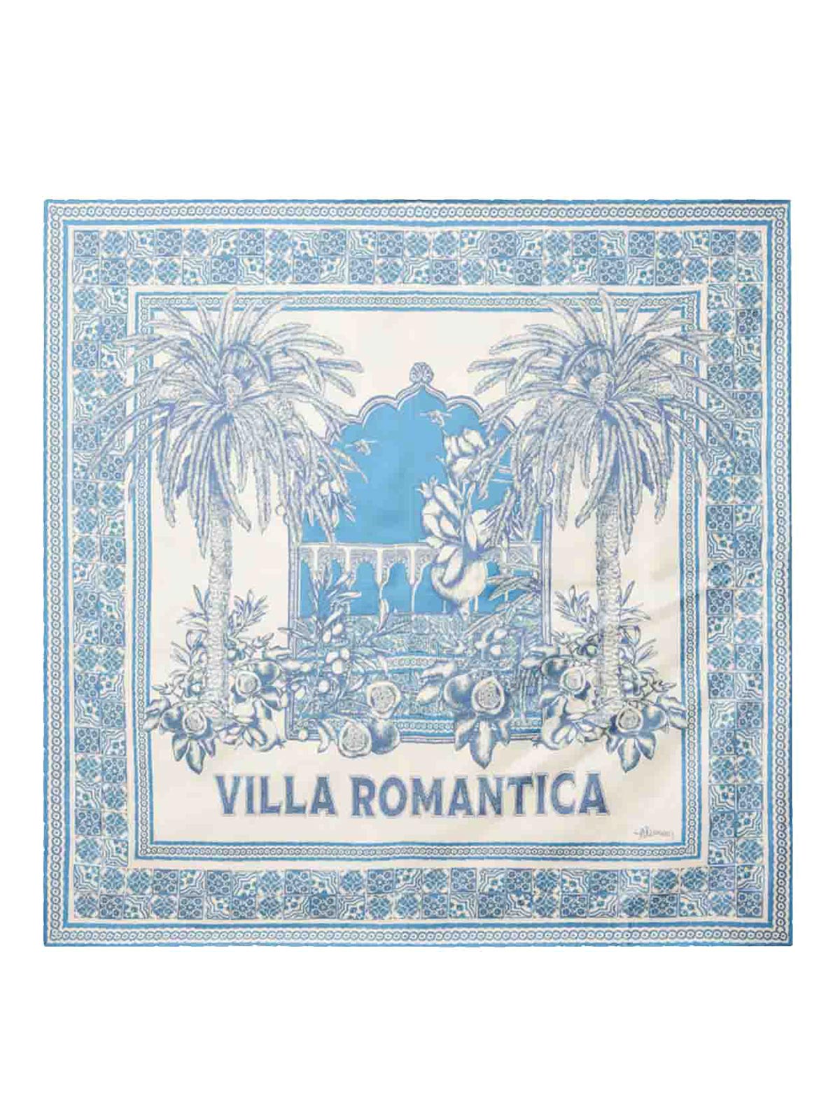 Printed square scarf with hand-rolled edge.