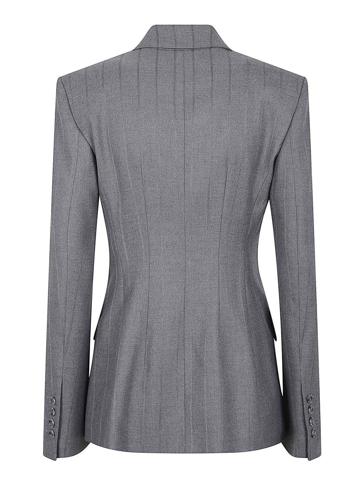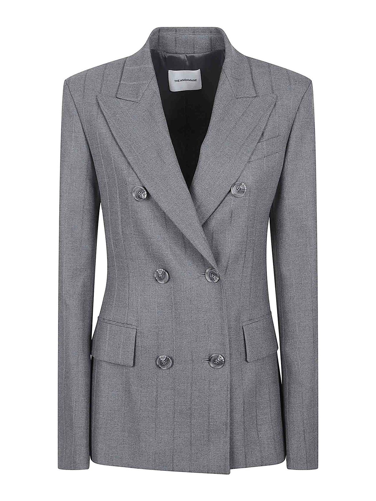 Shannon pinstriped jacquard blazer by The Andamane, double-breasted with a small internal button to secure the waist, peak lapels, buttoned cuffs, one welt pocket on the chest, and two flap pockets at the waist.