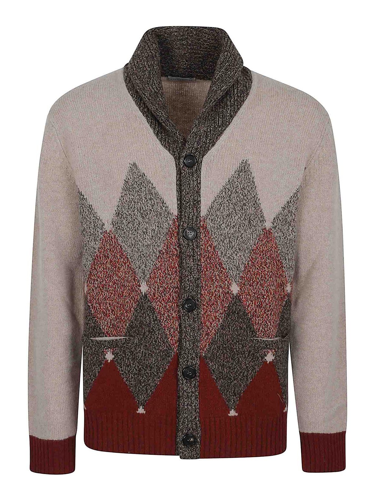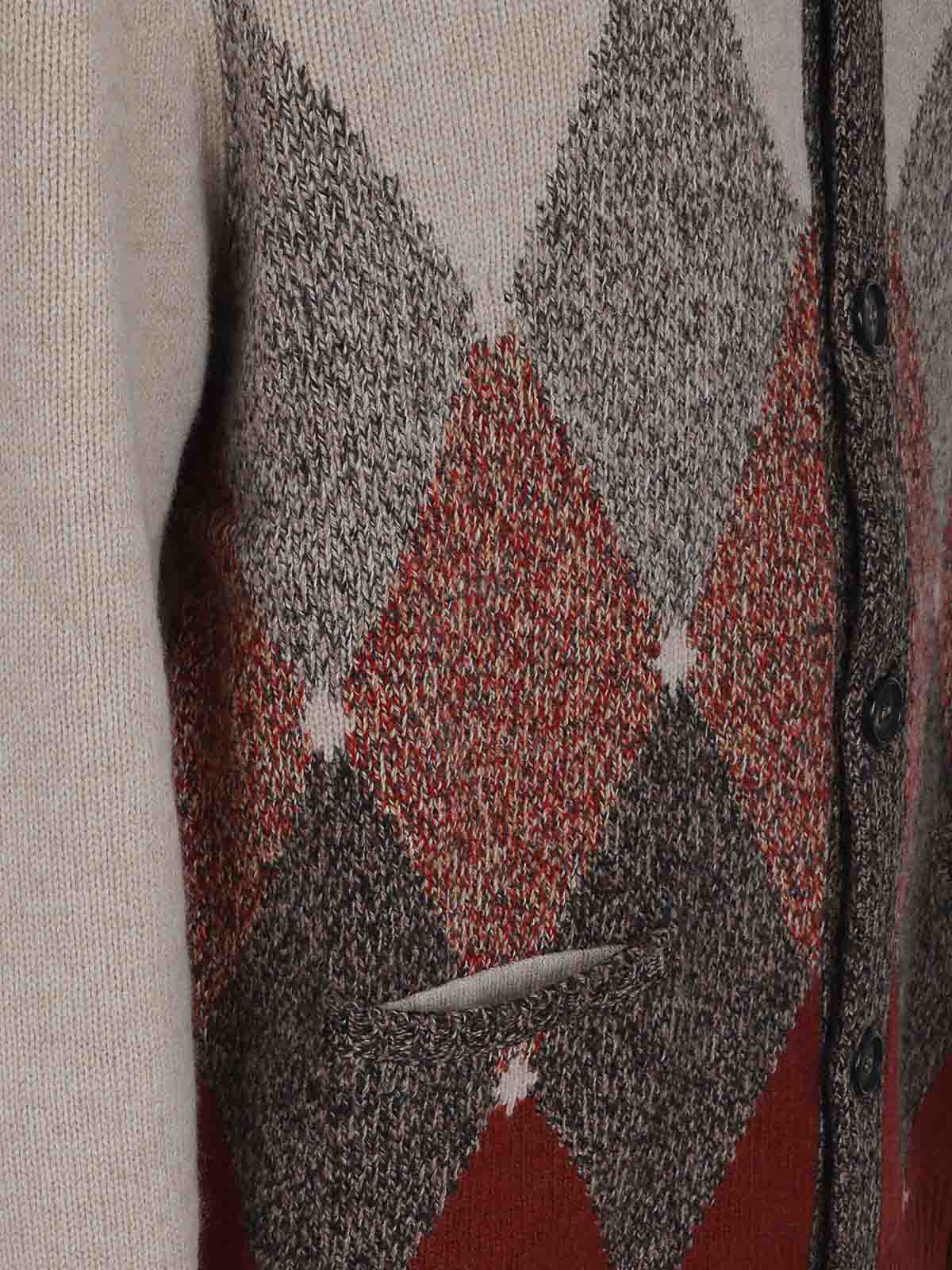 Pure Ballantyne diamond-pattern moulin wool cardigan, slightly V-neck, front button closure, two welt pockets, ribbed cuffs and hem, featuring a moulin yarn in the colors typical of its Scottish origins.