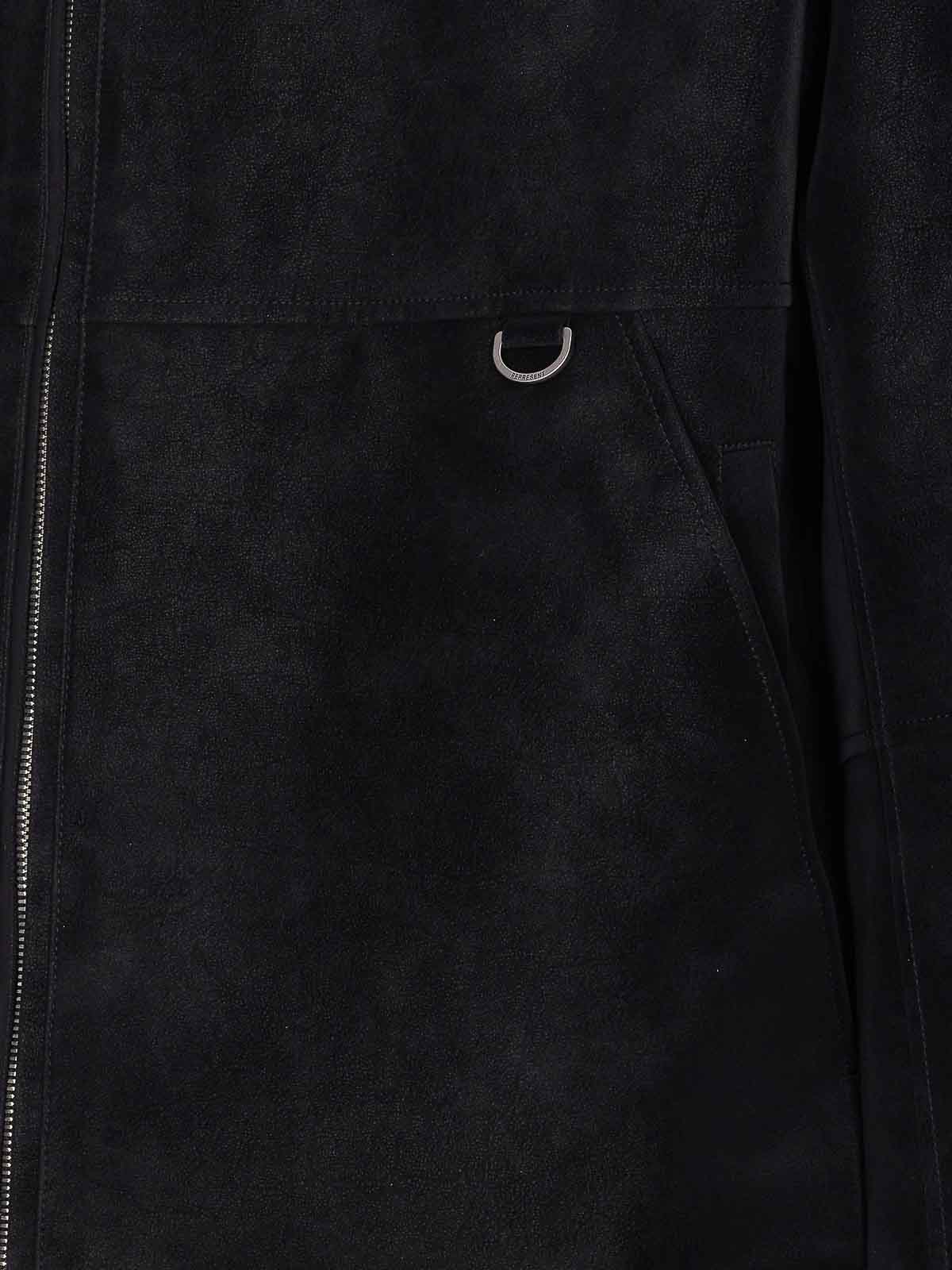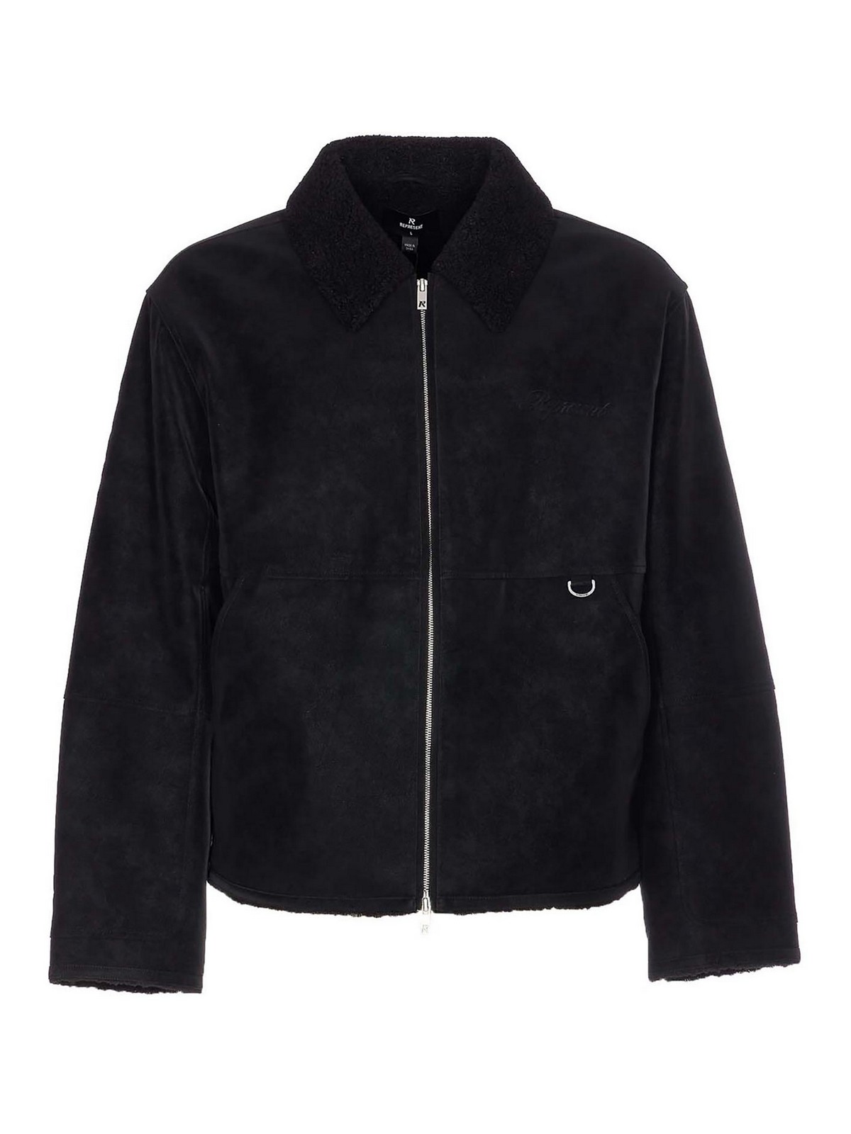 Represent black shearling jacket with frontal zip closure, collar, long sleeves, pockets on side, tone on tone embossd logo