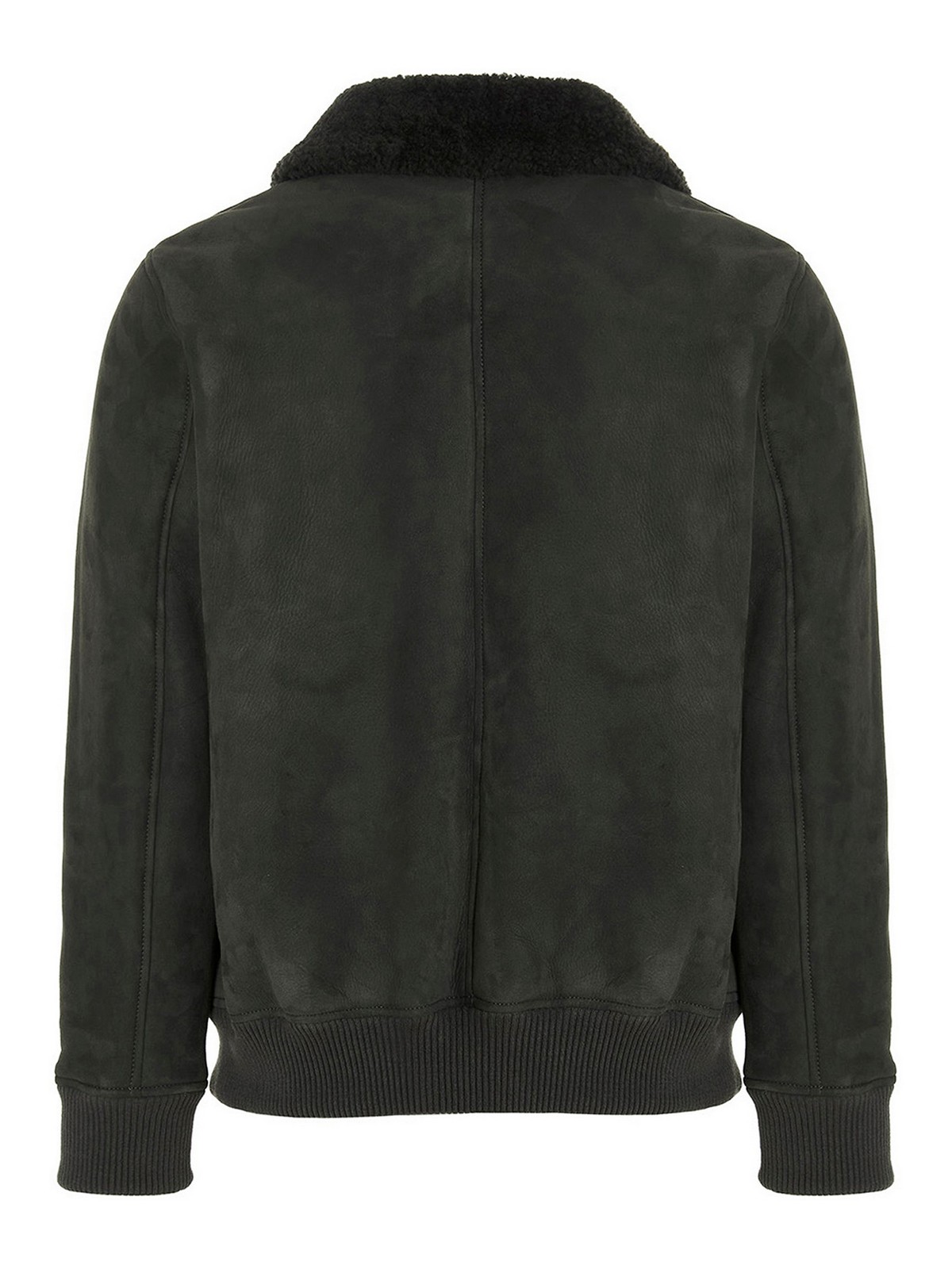 Suede jacket with shearling lining, zip closure, collar, long cuffed sleeves and pockets. anthracite green colour.