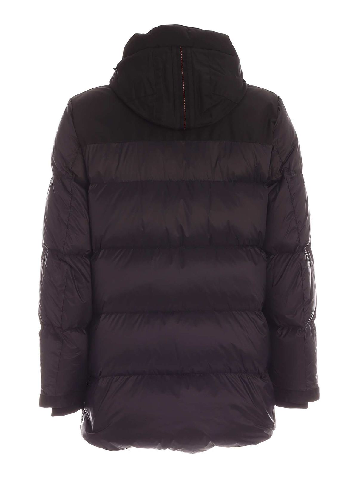 Quilted technical fabric down jacket Color: black Certified down padding Hood drawstring Logo patch on the sleeve Inner zip pocket Inner pocket Flap front pockets with zip Zipped side pockets Elasticated cuffs Double slider zip and buttons fastening