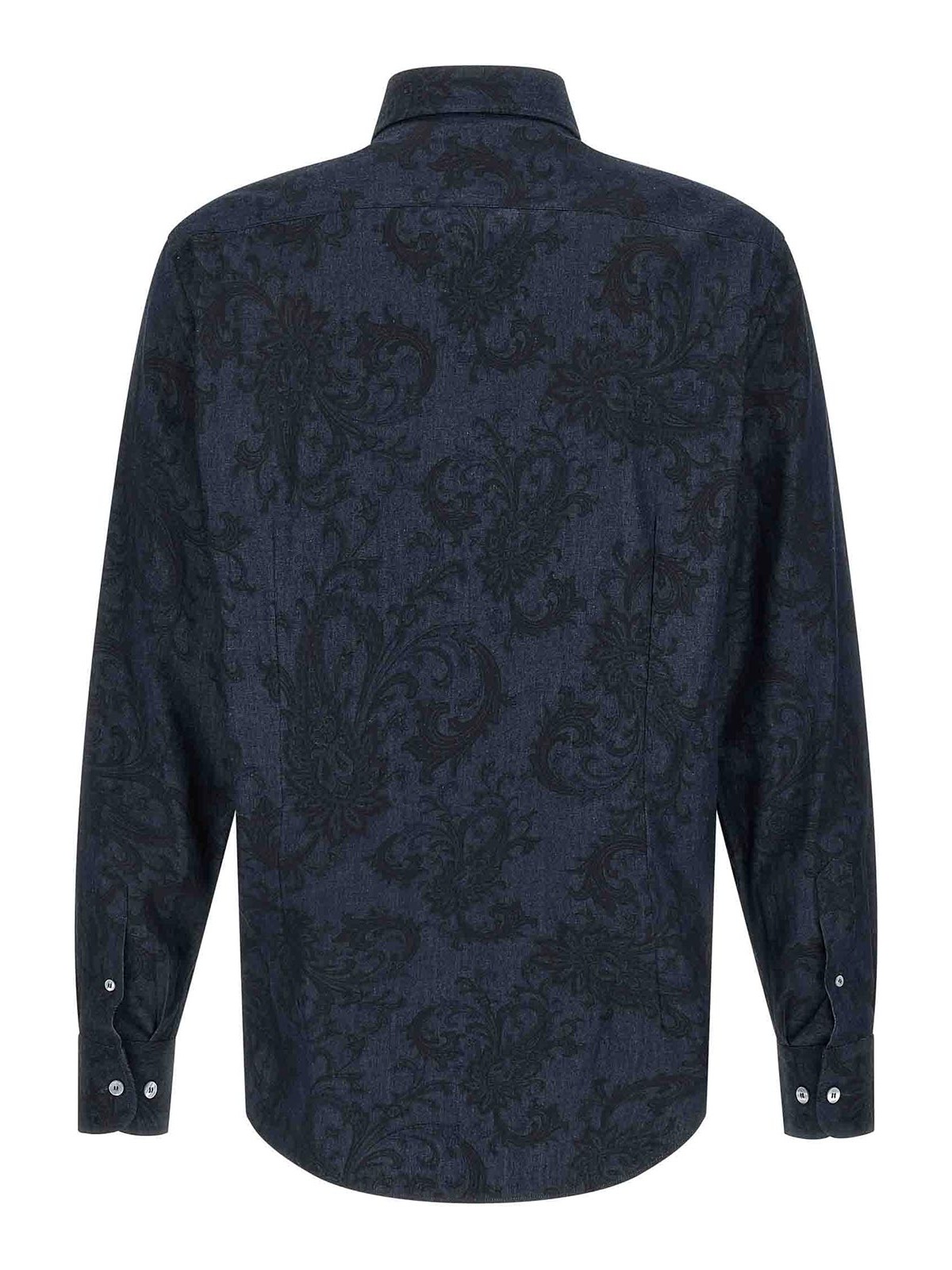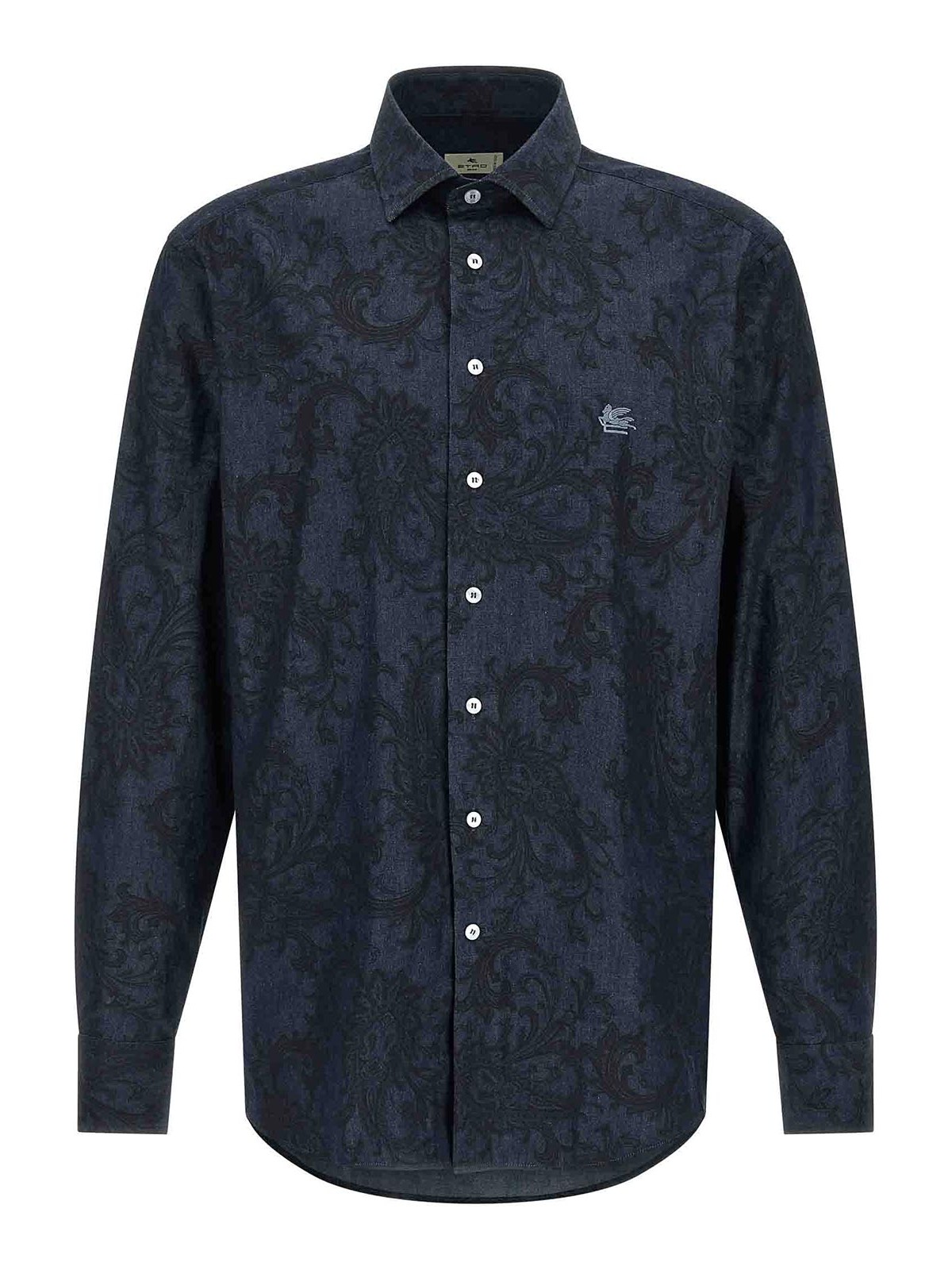 All-over 'paisley ramage' pure cotton denim shirt, 'pegaso' logo embroidery, front button closure, long cuffed sleeves.
