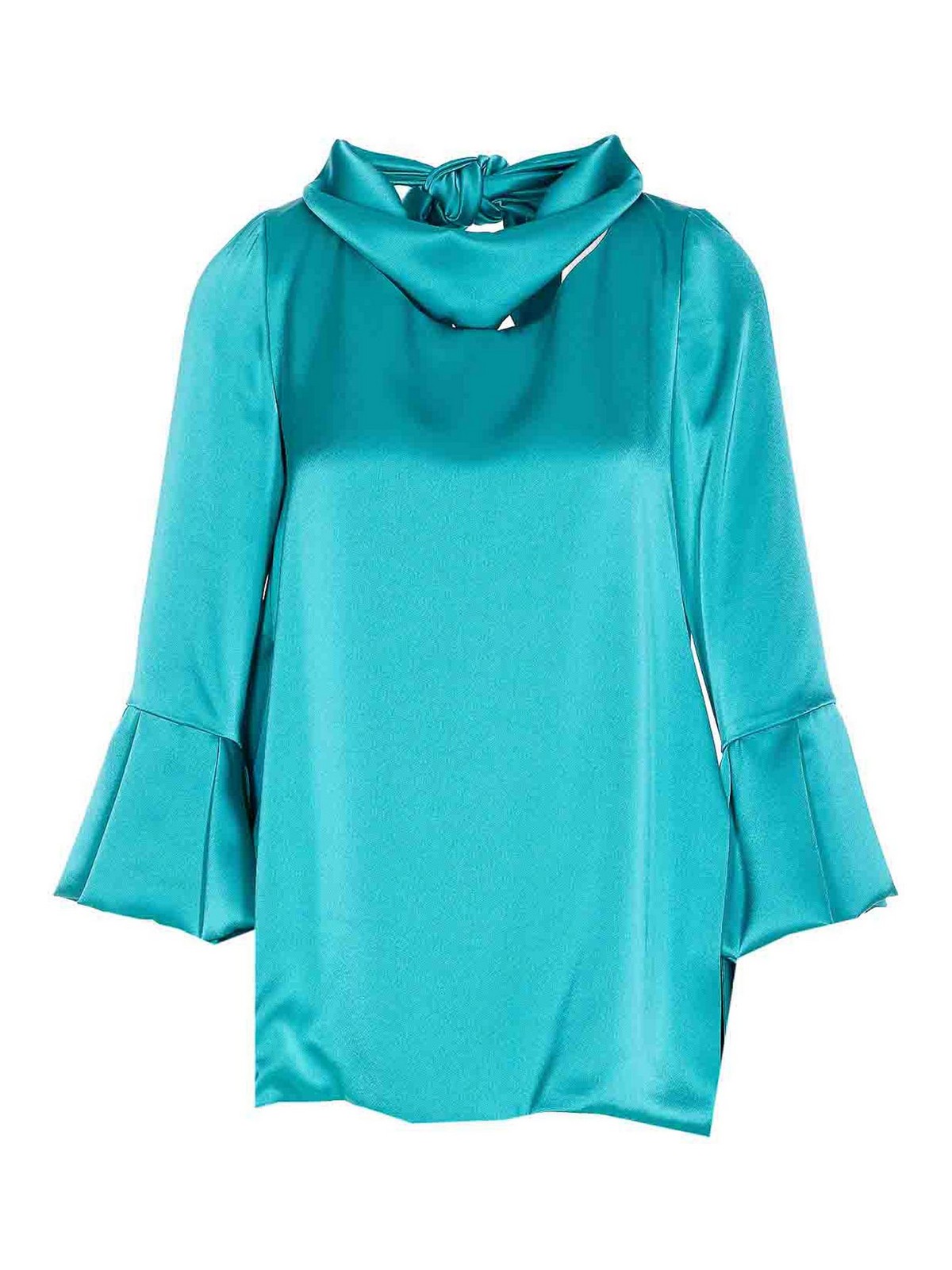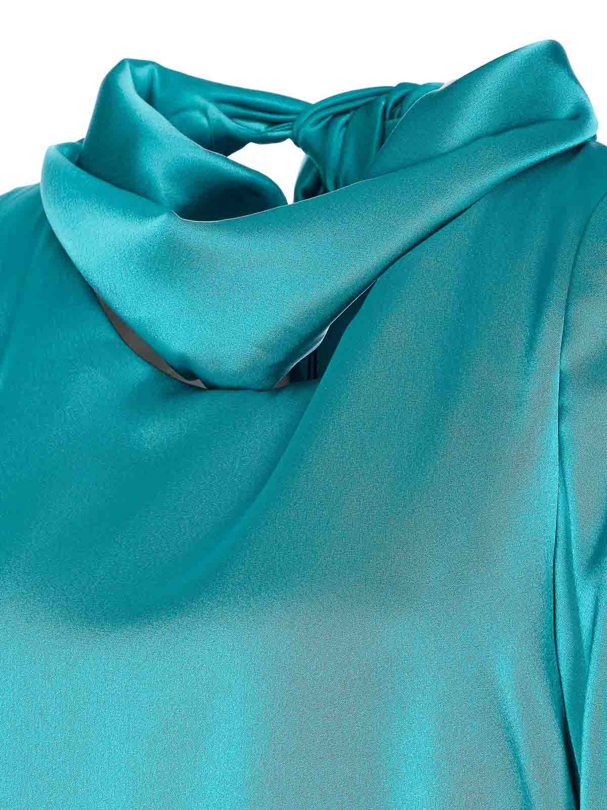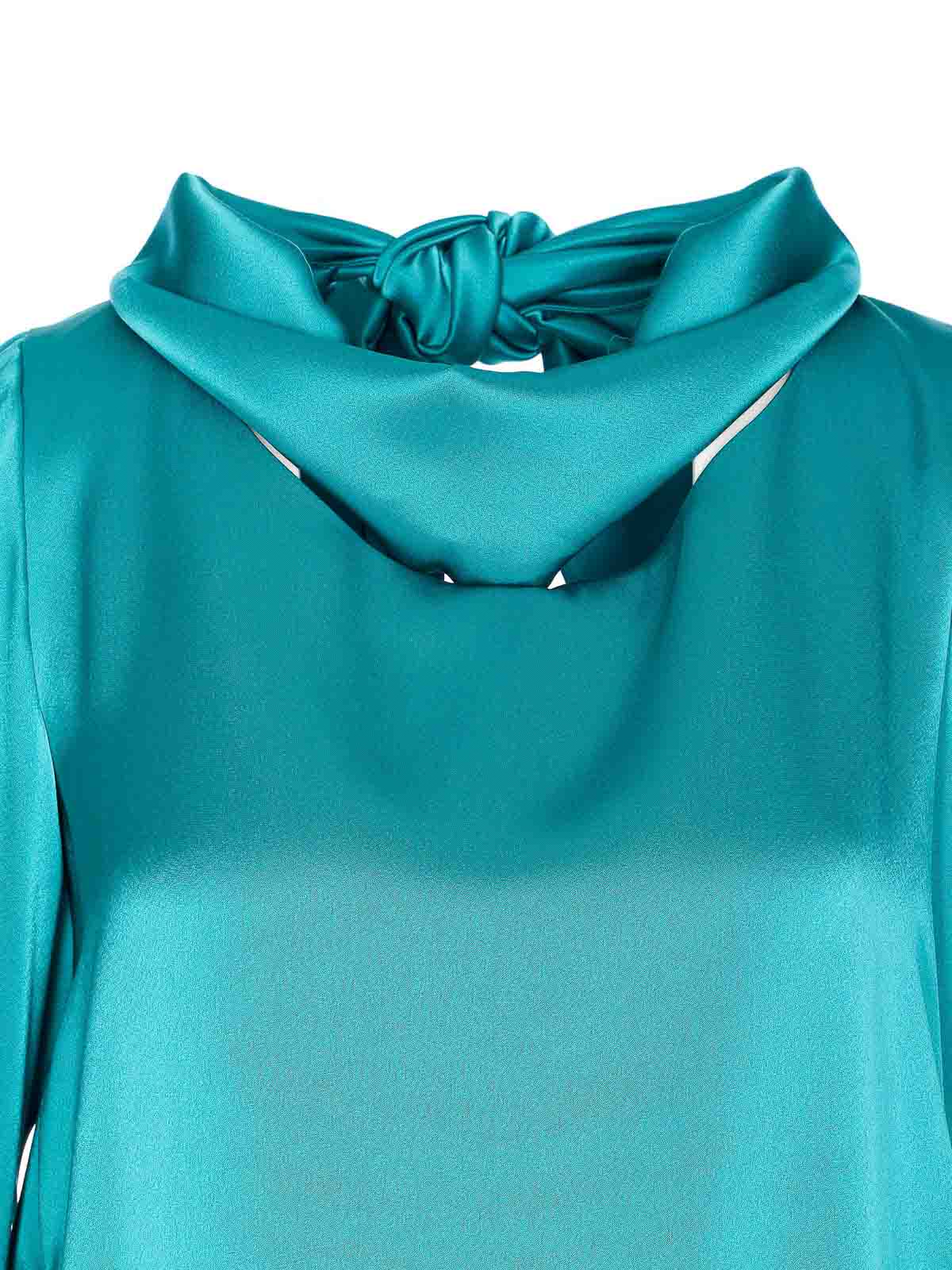 Light blue shirt button on the back bow on collar long sleeves bow on cuffs long sleeves effect