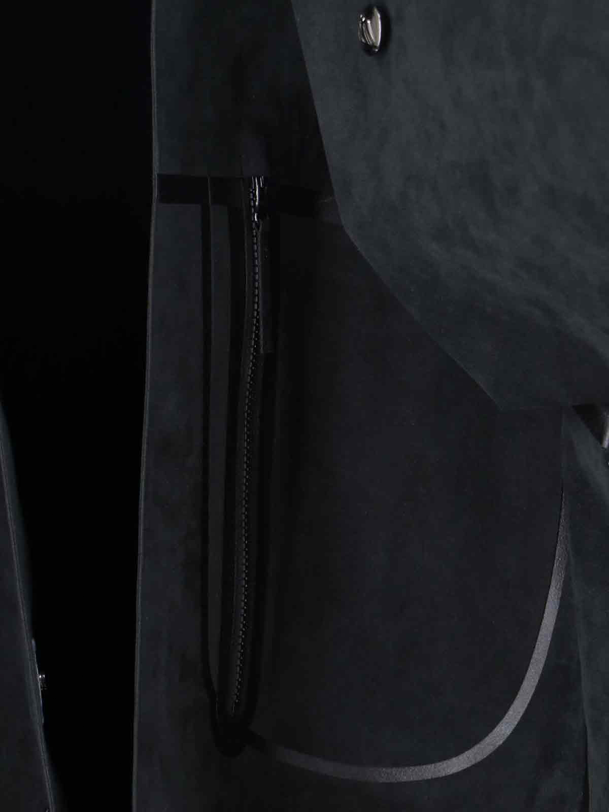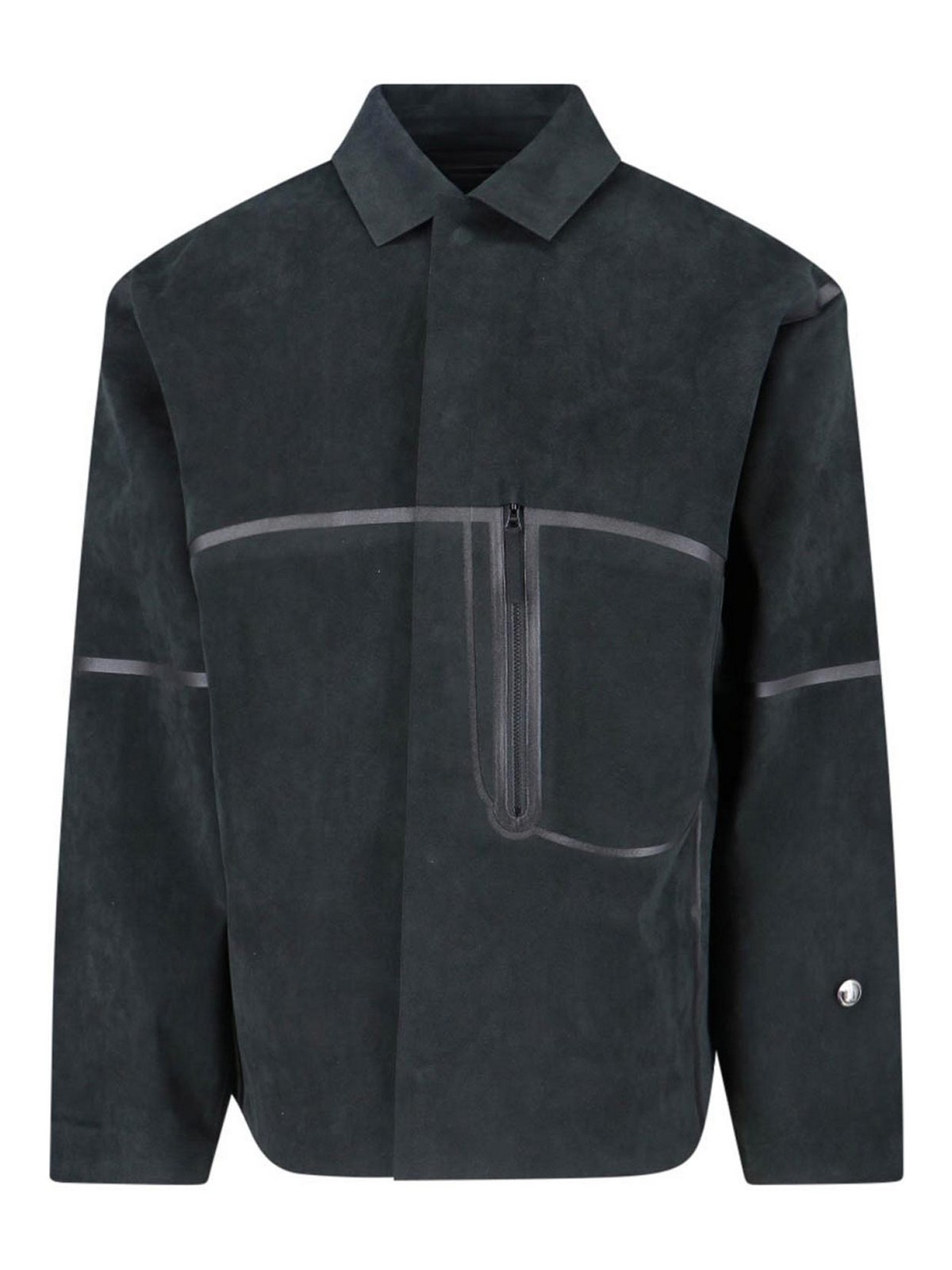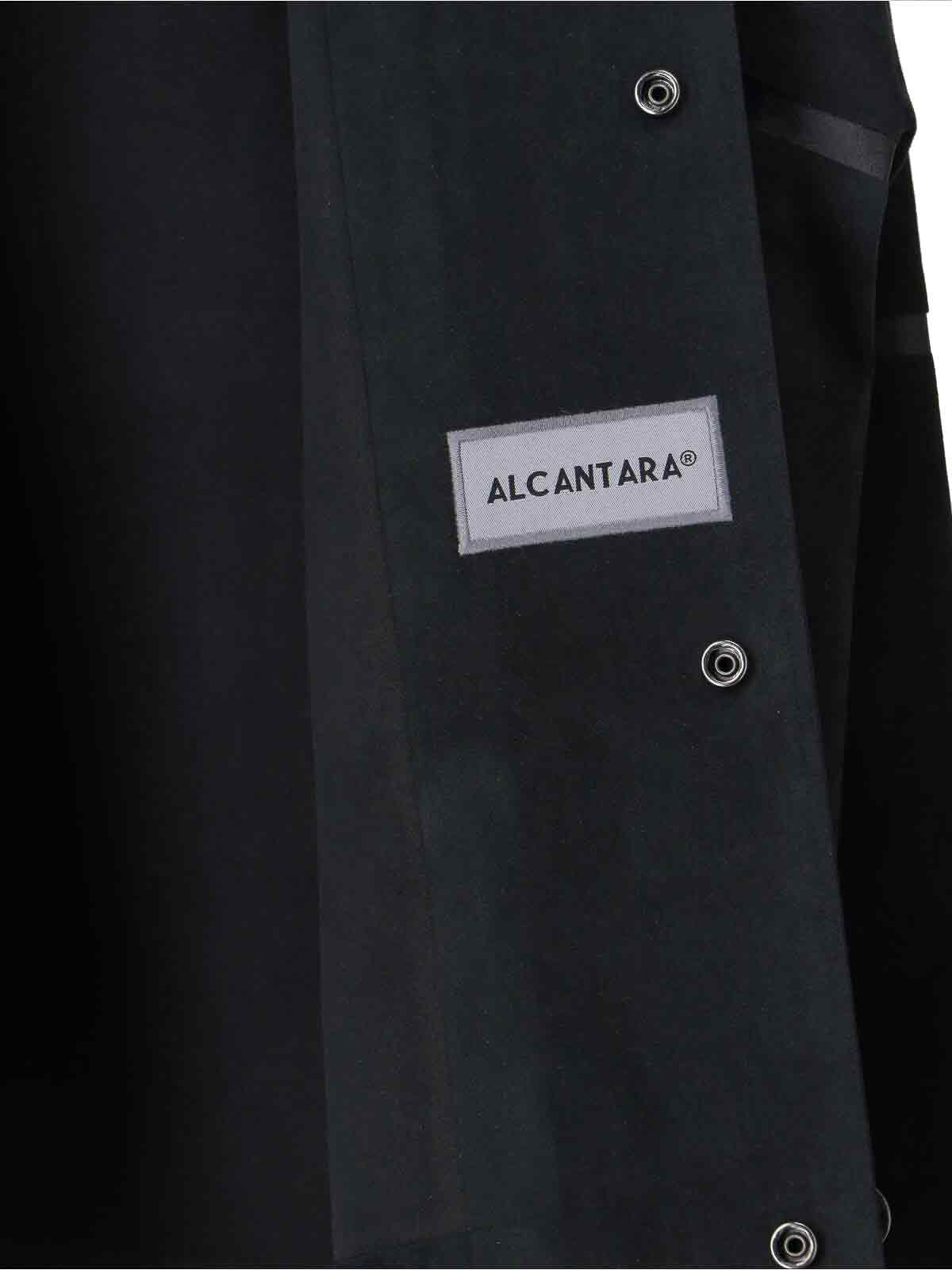 Massimo Osti Studio Alcantara shirt jacket, black, classic collar, snap button closure, contrasting finishes, one front zip pocket, internal hook detail, buttoned cuffs, straight hem.