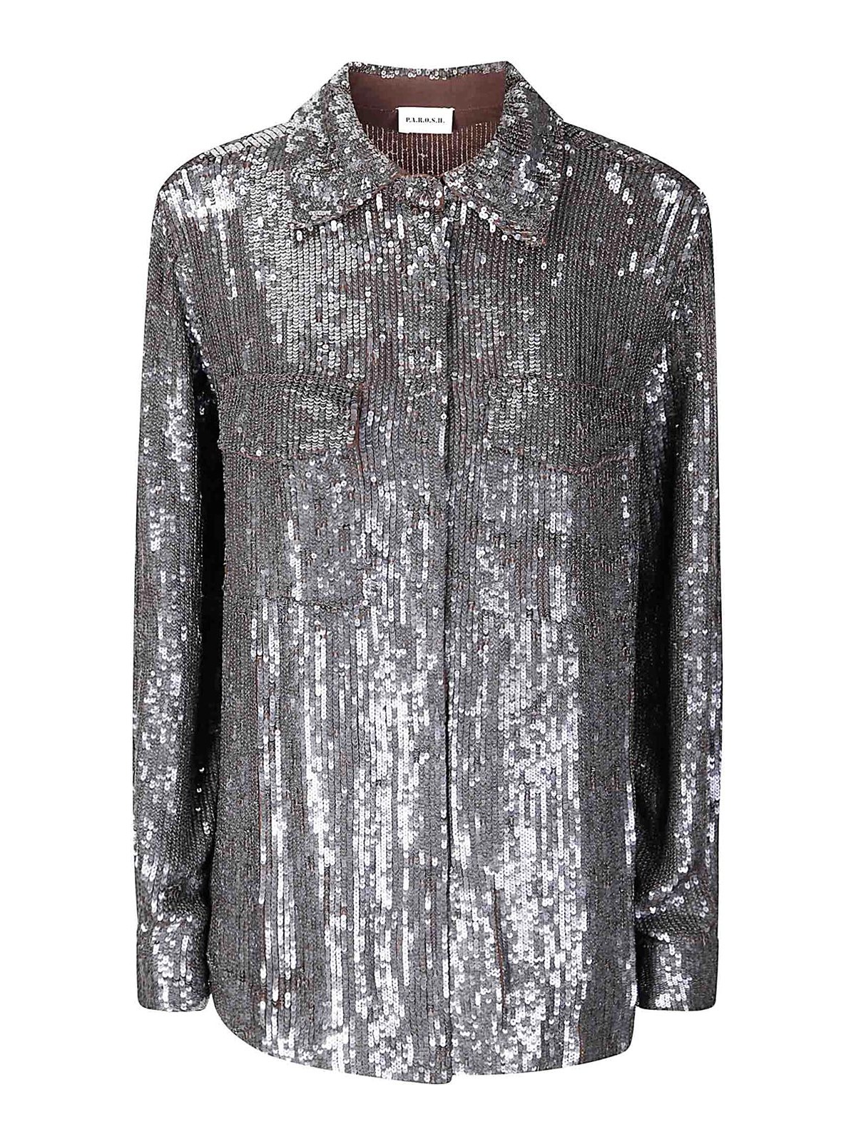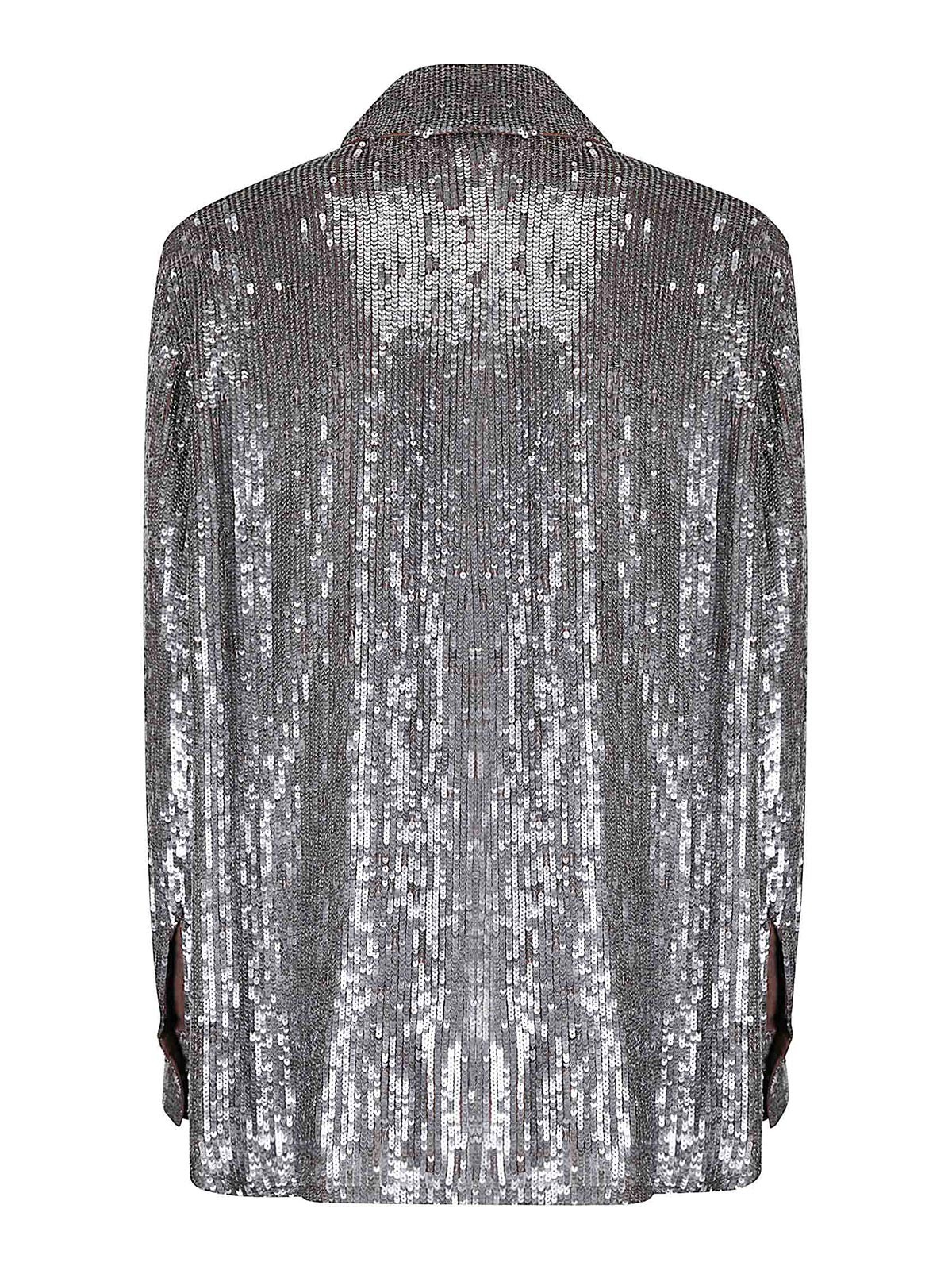 Oversized shirt with sequins, front button closure, long sleeves, front pockets.