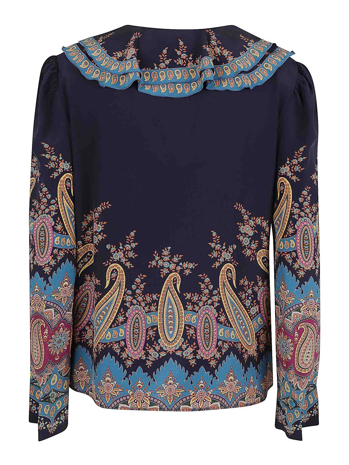 Pure silk crepe de chine shirt with a floral paisley print by etro, a deep V-neck, long sleeves, and a tone-on-tone covered button closure, featuring matching ruffles at the neckline.