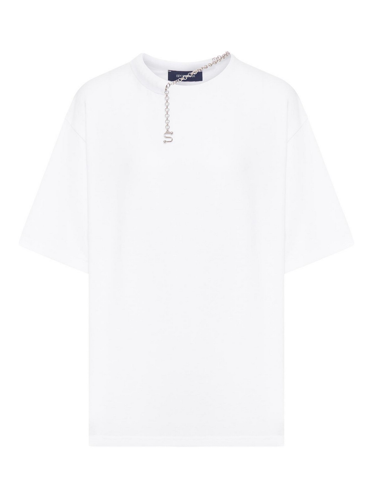 Pure t, shirt, straight fit, round neckline with original construction, ribbed along the edges, special neckline that allows you to a necklace with a personalized pendant, color white