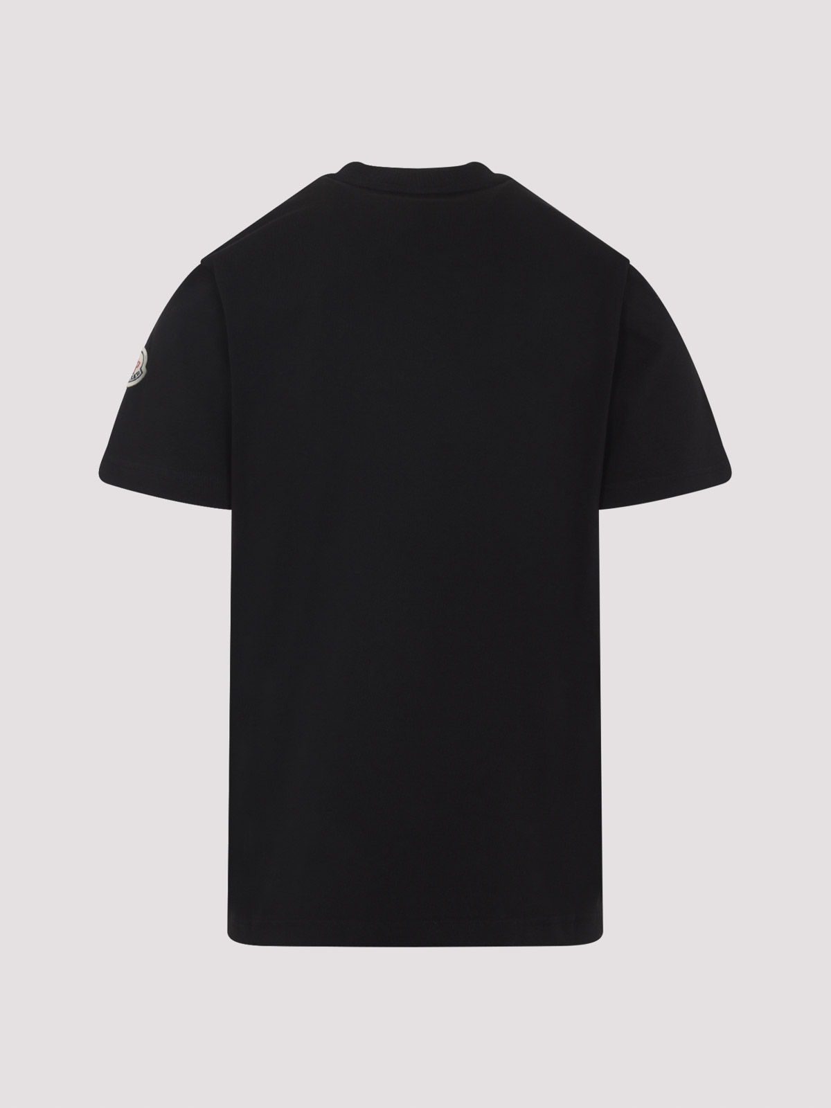 Moncler black cotton short sleeves t-shirt. pure black cotton t-shirt. round neck, chest contrasting grey signature printed logo, short sleeves, patch logo on the right sleeve, straight hem, tonal stitching.