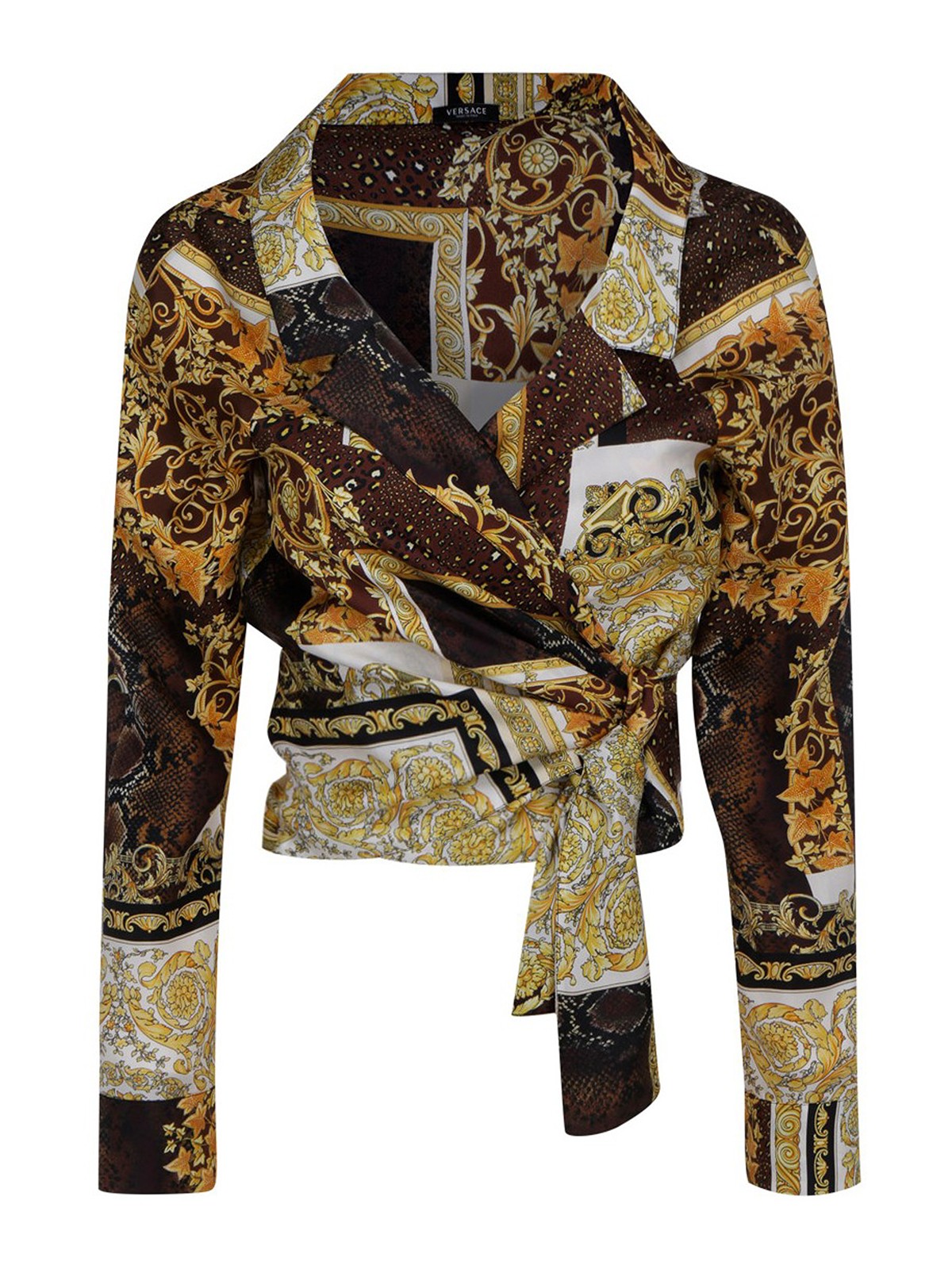 Silk cropped shirt feturing V neck, Baroque print all-over, V neck and knottable hem fastening.