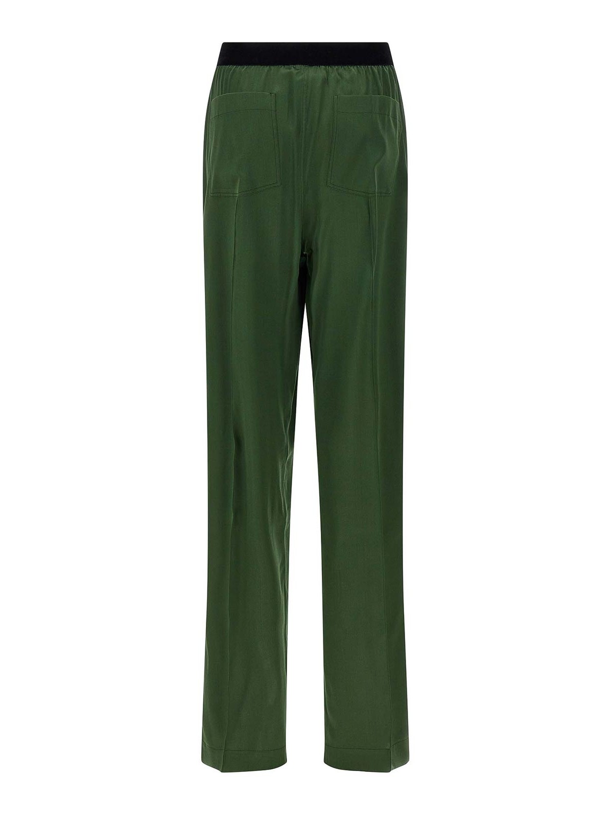 Stretch silk satin pants with pajama style, contrast velvet logo elastic band at the waist, pockets, straight leg, medium waist.