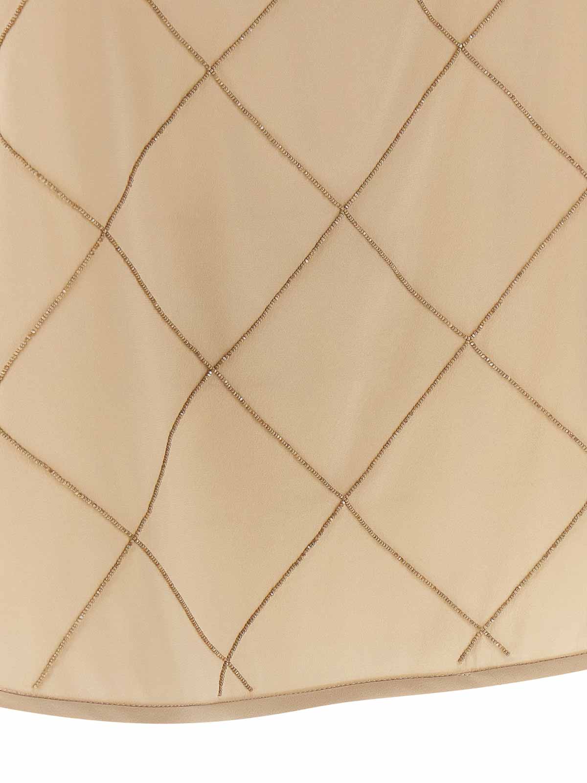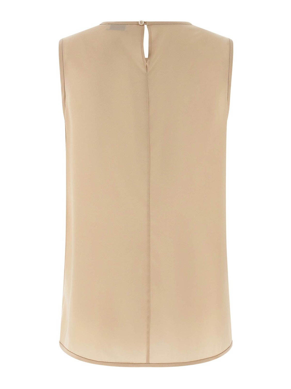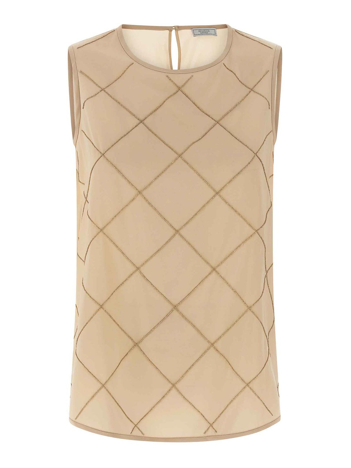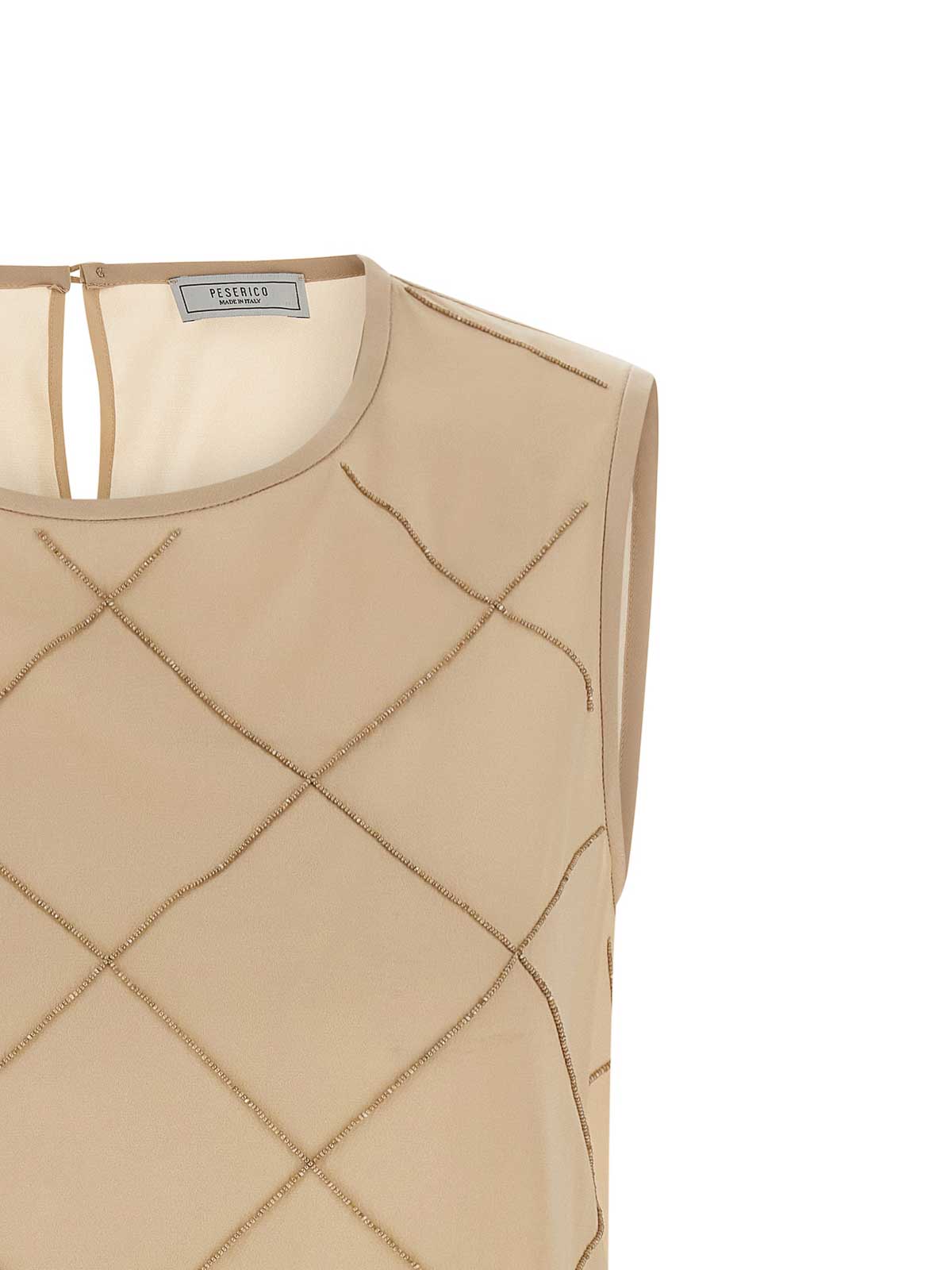 Crpe de chine silk top with geometric front beads appliqu, crew neck, back button closure with teardrop cut-out detail.